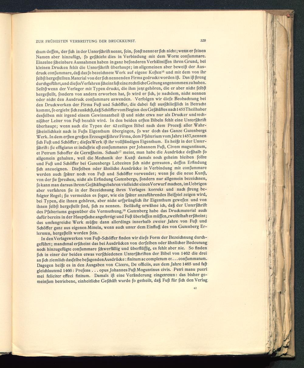thumdeffen, derßch in der Unterfchrift nennt, fein, fonß nennt erfich nicht; wenn er feinenNamen aber hinzufügt, fo geßhieht dies in Verbindung mit dem Worte confummare.Einzelne [cheinbare Ausnahmen haben in ganz befonderen Verhältniffen ihren Grund, beikleinen Drucken fehlt die Unterfchrift überhaupt; im allgemeinen aber beweiß der Aus-druck confummare, dag das fo bezeichnete Werk auf eigene Koften 16 und mit dem von ihrfelbß hergeßellten Material von der fich nennenden Firma gedruckt worden ifl. Das iß ßrengdurchgeführt,und diefesVerfahren fcheint faß eine rechtlicheGeltung angenommen zu haben.Selbftwenn der Verleger mit Typen druckt, die ihm jegtgehören, die er aber nicht felbfthergeftellt, fondern von andern erworben hat, fo wird er fich, je nachdem, nickt nennenoder nickt den Ausdruck confummare anwenden. Verfolgen wir dief'e Beobachtung beiden Druckwerken der Firma Fuft und Schöffer, die dabei faft ausjchließlich in Betrachtkommt, foergiebt fichzunächft,daßSchöffervomBeginn desGefchäftesnach 1455Theilhaberdesfelben mit irgend einem Gewinnantheil ift und nickt etwa nur als Drucker undtech-nifcher Leiter von Fuft bezahlt wird. In den beiden erften Bibeln fehlt eine Unterfchriftüberhaupt; wenn auch die Typen der 42zeiligen Bibel nach dem Prozeß aller Wahr-fcheinlichkeit nach in Fufts Eigenthum übergingen, fo war dock das Ganze Gutenbergs Werk. Indem erften großen Erzeugnißihrer Firma, dem Pfalterium vom Jahre 1457,nennenfick Fuß und Schöffer; diefesWerk iß ihr vollßändiges Eigenthum. Es heißt in der Unter-fckrift: ßc effigiatus et indußrie eßconfummatus perjohannem Fuß, Civem maguntinum,et Petrum Schöffer de Gernßheim. Schaab 17 meint, man habe die Ausdrücke deßhalb foallgemein gehalten, weil die Mechanik der Kunß damals noch geheim bleiben follteund Fuß und Schöffer bei Gutenbergs Lebzeiten fich nickt getrauten, deffen Erfindungfick anzueignen. Diefelben oder ähnliche Ausdrücke in Verbindung mit confummarewerden auch fpäter noch von Fuß und Schöffer verwendet; wenn ße die neue Kunß,von der ße fprechen, nickt als Erfindung Gutenbergs, fondern nur allgemein bezeichnen,fokann man daraus ihrem Gefchäftsgebahren vielleicht einenVorwurf macken, imUebrigenaber verfahren ße in der Bezeichnung ihres Verlages korrekt und nach ßreng be-folgter Regel; ße vermeiden es fogar, wie ein fpäter anzuführendes Beifpiel zeigen wird,bei Typen, die ihnen gehören, aber nickt urfprünglich ihr Eigenthum gewefen und vonihnen felbft hergeftellt find, fick zu nennen. Beiläufig erwähne ick, daß der Unterfckriftdes Pfalteriums gegenüber die Vermuthung, 18 Gutenberg habe das Druckmaterial auchdafür bereits in der Hauptfache angefertigt und Fuft überlaffen müffen,zweifelhaft erßkeint;das umfangreiche Werk müßte dann allerdings innerhalb zweier Jahre von Fuß undSchöffer ganz aus eigenen Mitteln, wenn auch unter dem Einfluß des von Gutenberg Er-lernten, hergeßellt worden fein.