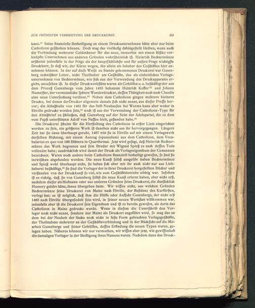 kann. 31 Seine finanzielle Betheiligung an einem Drudeunternehmen hätte aber nur beimCatholicon gefchehen können. Doch mag das vorläufig dahingeßellt bleiben, wenn auchdie Verbindung mehrerer Geldmänner für das neue, immerhin mit einem Rifiko ver-knüpfte Unternehmen aus anderen Gründen wahrfcheinlich iß. Heinrich Bechtermünzeerjeheint jedenfalls in der Folge als der hauptfächlichße und für unfere Frage wichtigßeDruckherr, fo daß wir, der Kürze wegen, ihn allein als Inhaber des Gefchäftes hier an-nehmen können. In der auf diefe Weife zu Stande gekommenen Druckerei war Guten-berg technijcher Leiter, nicht Theilhaber am Gefchäfte, das als einheitliches Verlags-unternehmen von Bechtermünze, wie (ich aus der Verwendung des Druckapparates er-giebt, anzufehen iß. In diefer Druckwerkßätte waren alsGehülfen u. a. befchäftigtder ausdem Prozeß Gutenbergs vom Jahre 1455 bekannte Heinrich Keffer 32 und JohannNumeißer, der vermeintliche fpätere Wanderdrucker, dejfen Thätigkeit auch nach Claudineine neue Unterfuchung verdient. 33 Neben dem Catholicon gingen mehrere kleinereDrucke, bei denen derDrucker allgemein damals ßch nicht nennt, aus diefer Preffe her-vor; die Ablaßbulle von 1461 für das Stift Neuhaufen bei Worms kann aber weder inEltville gedruckt worden fein, 34 noch iß aus der Verwendung der Catholicon-Type fürden Ablaßbrief zu fchließen, daß Gutenberg auf der Seite der Adelspartei, die zu demvom Papft unterftütjten Adolf von Naffau hielt, geßanden habe. 35