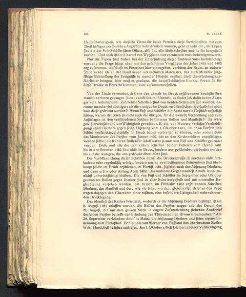 Von der Linde vermuthet, dag von den damals im Druck erßhienenen Streitfchriftenmanche verloren gegangen feien; zweifellos mit Unrecht, es findet fich dafür in den Aktengar kein Anhaltspunkt. Zahlreiche Schriften find von beiden Seiten erlaffen worden, da-runter manche viel wichtigere als die wenigen im Druck veröffentlichten, weghalb find nichtauch diefe gedruckt worden? Wenn Fuft und Schöffer die Sache nur als Gefchäft aufgefagthätten, warum druckten fie nicht auch die übrigen, für die weitefteVerbreitung und zumAnfchlagen in den verfchiedenen Städten beftimmten Bullen und Manifege? Es wäregewig erwünfcht und vonWichtigkeit gewefen, z. B. die von Humery verfagte Vertheidi-gungsfchrift Diethers gegen feine Abfetjung vom 1. Oktober 1461, die er an Fürften undStädte verfchickte, gleichfalls im Druck haben verbreiten zu können, oder andererfeitsdas Monitorium des Papftes vom Januar 1462, das an den Kirchenthüren angefchlagenwerden follte; die früheren Bullen für Adolfwaren ja auch von Fuft und Schöffer gedrucktworden. Diefe und alle die zahlreichen Schriften beider Parteien vom Herbft 1461bis in den Sommer 1462 find nicht im Druck, fondern nur gefchrieben verbreitet wordenbis auf die wenigen, die uns gedruckt überliefert find.