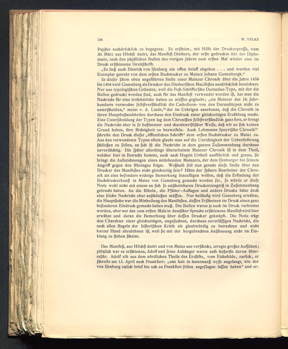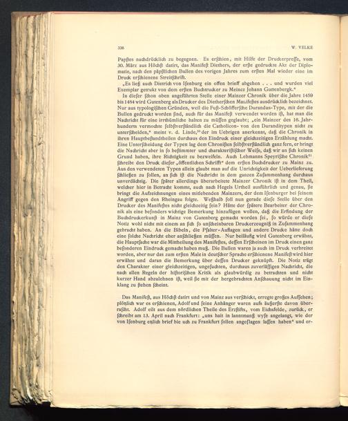 In diefer fchon oben angeführten Stelle einer Mainzer Chronik über die Jahre 1459bis 1484 wird Gutenberg als Drucker des Dietherjchen Manifeftes ausdrücklich bezeichnet.Nur aus typologifchen Gründen, weil die Fuß-Schöfferfche Durandus-Type, mit der dieBullen gedruckt worden find, auch für das Manifeß verwendet worden ift, hat man dieNachricht für eine irrthümliche halten zu müffen geglaubt; „ein Mainzer des 16. Jahr-hunderts vermochte felbßverßändlich die Catholicon- von den Duranditypen nicht zuunterjeheiden,“ meint v. d. Linde, 50 der im Uebrigen anerkennt, daß die Chronik inihren Hauptbeßandtheilen durchaus den Eindruck einer gleichzeitigen Erzählung macht.Eine Unterjcheidung der Typen lag dem Chronißen felbßverßändlich ganz fern, er bringtdie Nachricht aber in fo beftimmter und charakteriftifcher Weife, daß wir an ßch keinenGrund haben, ihre Richtigkeit zu bezweifeln. Audi Lehmanns Speyrifche Chronik 51fchreibt den Druck diefer „öffentlichen Schrifft“ dem erßen Buchdrucker zu Mainz zu.Aus den verwendeten Typen allein glaubt man auf die Unrichtigkeit der Ueberlieferungfchließen zu füllen, an ßch iß die Nachricht in dem ganzen Zufammenhang durchausunverdächtig. Die fpäter allerdings überarbeitete Mainzer Chronik iß in dem Theil,welcher hier in Betracht kommt, auch nach Hegels Urtheil ausführlich und genau, ßebringt die Aufzeichnungen eines mitlebenden Mainzers, der dem Ifenburger bei feinemAngriff gegen den Rheingau folgte. Weßhalb foll nun gerade diefe Stelle über denDrucker des Manifeftes nicht gleichzeitig fein? Hätte der fpätere Bearbeiter der Chro-nik als eine befonders wichtige Bemerkung hinzufügen wollen, daß die Erfindung derBuchdruckerkunß in Mainz von Gutenberg gemacht worden fei, fo würde er diefeNotiz wohl nicht mit einem an ßch fo unfeheinbaren Druckerzeugniß in Zufammenhanggebracht haben. An die Bibeln, die Pfalter-Auflagen und andere Drucke hätte docheine folche Nachricht eher anßhließen müffen. Nur beiläufig wird Gutenberg erwähnt,die Hauptfache war die Mittheilung des Manifeftes, deffen Erfcheinen im Druck einen ganzbefonderen Eindruck gemacht haben muß. Die Bullen waren ja auch im Druck verbreitetworden, aber nur das zum erften Malein deutßher Sprache erßhienene Manifeßwird hiererwähnt und daran die Bemerkung über deffen Drucker geknüpft. Die Notiz trägtden Charakter einer gleichzeitigen, ungefuchten, durchaus zuverläfßgen Nachricht, dienach allen Regeln der hißorifchen Kritik als glaubwürdig zu betrachten und nichtkurzer Hand abzulehnen iß, weil ße mit der hergebrachten Anfchauung nicht im Ein-klang zu ftehen fcheint.