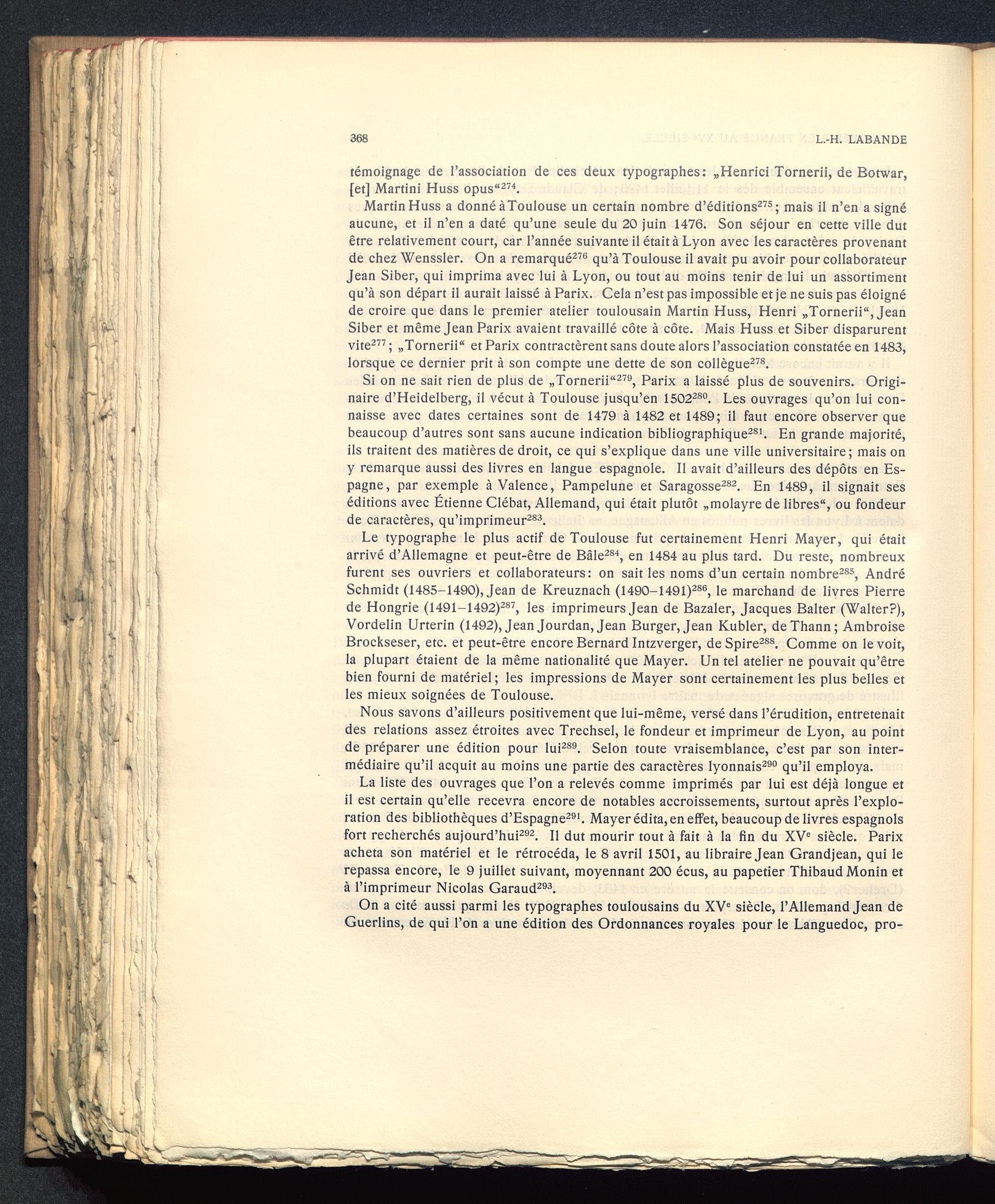 MartinHuss a donnéàToulouse un certain nombre d’éditions 275 ; mais il n’en a signéaucune, et il n’en a daté qu’une seule du 20 juin 1476. Son séjour en cette ville dutêtre relativement court, car l’année suivante il était à Lyon avec les caractères provenantde chez Wenssler. On a remarqué 276 qu’à Toulouse il avait pu avoir pour collaborateurJean Siber, qui imprima avec lui à Lyon, ou tout au moins tenir de lui un assortimentqu’à son départ il aurait laissé à Parix. Cela n’est pas impossible et je ne suis pas éloignéde croire que dans le premier atelier toulousain Martin Huss, Henri „Tornerii“, JeanSiber et même Jean Parix avaient travaillé côte à côte. Mais Huss et Siber disparurentvite 277 ; „Tornerii“ et Parix contractèrent sans doute alors l’association constatée en 1483,lorsque ce dernier prit à son compte une dette de son collègue 278 .