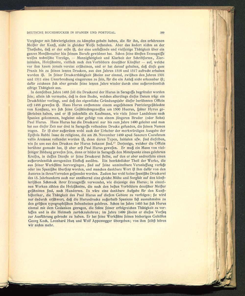In demfelben Jahre 1485 foll die Druckerei der Hurus in Saragoffa begründet wordenfein; allein ich vermuthe, daß in dem Buche, welches allerdings diefes Datum trägt einDruckfehler vorliegt, und daß das eigentliche Gründungsjahr diefer berühmten Offizinerft 1488 gewefen iß. Hans Hurus entftammte einem angefehenen Patriziergeßhlechtevon Konftanz, wo ßch feine Gefchlechtsgenoflen um 1500 Huerus, fpäter Hyrus ge-fchrieben haben, und er ift jedenfalls als Kaufmann, wie viele feiner Landsleute nachSpanien gekommen, begleitet oder gefolgt von einem jüngeren Bruder (oder Sohn)Paul Hurus . Hans Hurus hat die Druckerei nur bis zum Jahre 1490 geleitet und manhat aus diefer Zeit nur drei in Saragoßa vollendete Drucke gefunden, die feinen Namentragen. Er ift aber außerdem wohl auch der Urheber der merkwürdigen Ausgabe derEpißola Rabbi Isaac de religione, die am 29. November 1489 apud Sanctum Cucufatumvallis Aretanae vollendet worden iß, denn deren Typen, Initialen ufw. find diefelben,wie ße uns aus den Drucken der Hurus bekannt find. 17 Derjenige, welcher die Offizinberühmt gemacht hat, ift aber erft Paul Hurus gewefen. Er muß ein Mann von viel-feitiger Bildung gewefen fein, denn er bildet in Saragoffa den Mittelpunkt eines gelehrtenKreifes, in deffen Dienfte er feine Druckerei ßellte, auf den er aber andrerfeits einenaußerordentlich anregenden Einfluß ausübte. Ein beträchtlicher Theil der Werke, dieaus feiner Werkßätte hervorgingen, find auf feine unmittelbare Veranlaffung verfaßtoder ins Spanifche überfetjt worden, und manches dankbare Wort ift ihm dafür von denAutoren in ihrenVorreden gefpendet worden. Zudem hat wohl keine fpanijehe Druckereides 15. Jahrhunderts auch nur annähernd eine gleiche Mühe und Sorgfalt auf den künß-lerifchen Schmuck ihrer Erzeugniffe verwendet, wie diejenige des Hurus; in einzel-nen Werken zählen die Holzfchnitte, die nach den beften Vorbildern deutfeher Meiftergefdhnitten find, nach Hunderten. Es wäre eine dankbare Aufgabe für den Kunft-hiftoriker, die Thätigkeit des Paul Hurus auf diefem Gebiete zu verfolgen; ße wirdnur dadurch erßhwert, daß die Hurusdrucke außerhalb Spaniens faß ausnahmslos zuden größten typographifchen Seltenheiten gehören. Schon im Jahre 1493 hat ßch Hurus einmal mit dem Gedanken getragen, die Stätte feiner erfolgreichen Thätigkeit zu ver-laßen und in die Heimath zurückzukehren; im Jahre 1499 fcheint er diefen Vorfatjzur Ausführung gebracht zu haben. Er hat feine Werkßätte feinen bisherigen GehilfenGeorg Koch, Leonhard Hut? und Wolf Appentegger übergeben; von ihm felbß hörenwir nichts mehr.