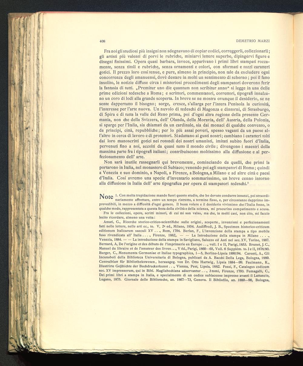 Non sarà inutile rassegnarli qui brevemente, cominciando da quelli, die primi laportarono in Italia, nel monastero di Subiaco; venendo poi agli stampatori di Roma ; quindia Venezia e suo dominio, a Napoli, a Firenze, a Bologna, a Milano e ad altre città e paesid’Italia . Cosi avremo una specie d’inventario sommarissimo, un breve cenno intornoalla diffusione in Italia dell’ arte tipografica per opera di stampatori tedeschi . 1 * * * 5