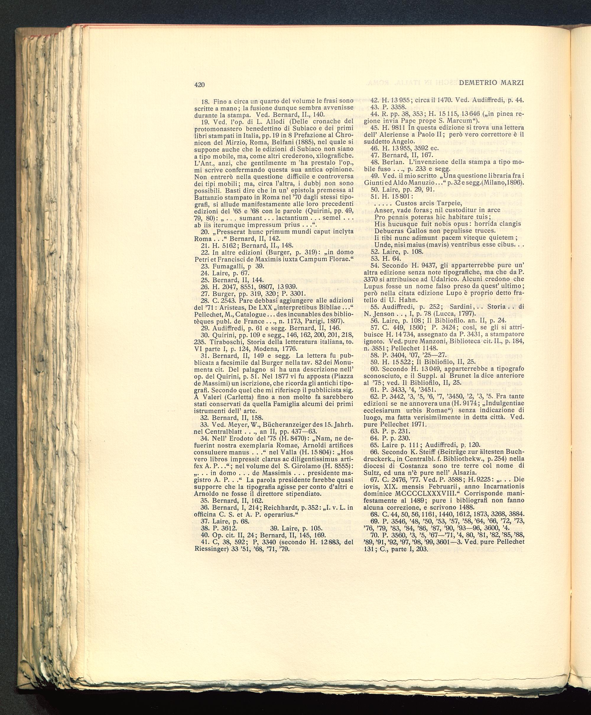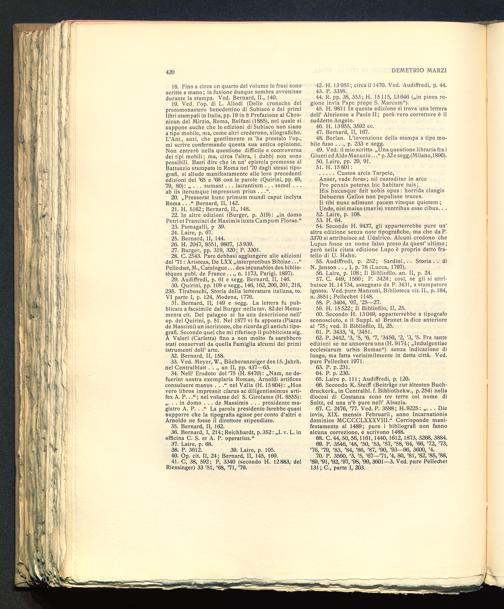 31. Bernard, II, 149 e segg. La lettera fu pub-blicata a facsimile dal Burger nella tav. 82dei Monu-menta cit. Del palagno si ha una descrizione nell’op. del Quirini, p. 51. Nel 1877 vi fu apposta (Piazzade Massimi) un iscrizione, che ricorda gli antichi tipo-grafi. Secondo quel che mi riferiscp il pubblicista sig.A Valeri (Cadetta) fino a non molto fa sarebberostati conservati da quella Famiglia alcumi dei primiistrumenti dell’ arte.