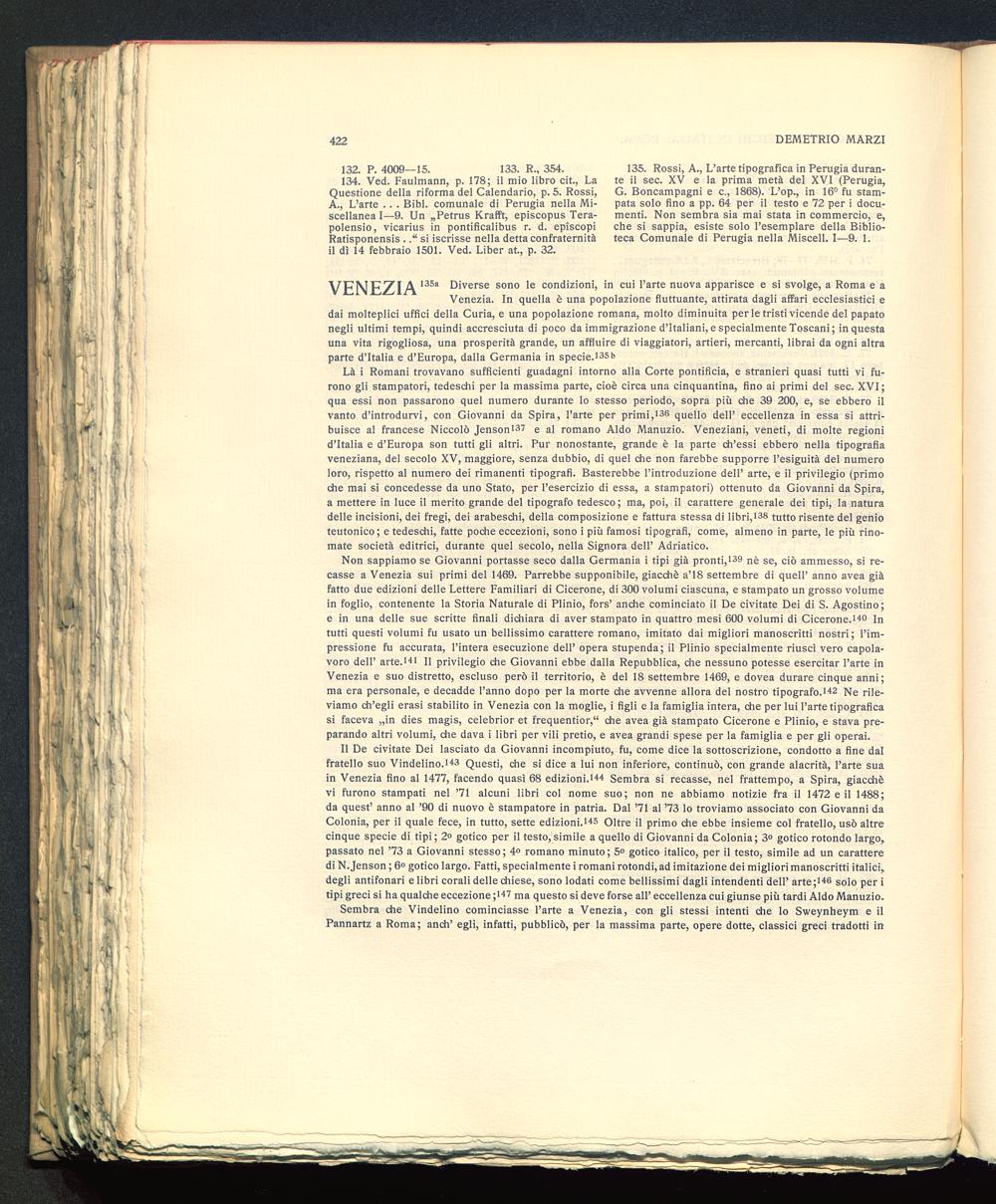 Non sappiamo se Giovanni portasse seco dalla Germania i tipi già pronti,>39 nè se, ciò ammesso, si re-casse a Venezia sui primi del 1469. Parrebbe supponibile, giacché a’18 settembre di quell’ anno avea giàfatto due edizioni delle Lettere Familiari di Cicerone, di 300 volumi ciascuna, e stampato un grosso volumein foglio, contenente la Storia Naturale di Plinio, fors’ anche cominciato il De civitate Dei di S. Agostino;e in una delle sue scritte finali dichiara di aver stampato in quattro mesi 600 volumi di Cicerone. 146 j ntutti questi volumi fu usato un bellissimo carattere romano, imitato dai migliori manoscritti nostri ; l’im-pressione fu accurata, l’intera esecuzione dell’ opera stupenda; il Plinio specialmente riuscì vero capola-voro dell’ arte. 141 Il privilegio che Giovanni ebbe dalla Repubblica , che nessuno potesse esercitar l’arte inVenezia e suo distretto, escluso però il territorio, è del 18 settembre 1469, e dovea durare cinque anni;ma era personale, e decadde l’anno dopo per la morte che avvenne allora del nostro tipografo. 142 Ne rile-viamo ch’egli erasi stabilito in Venezia con la moglie, i figli e la famiglia intera, che per lui l’arte tipograficasi faceva „in dies magis, celebrior et frequentior,“ che avea già stampato Cicerone e Plinio , e stava pre-parando altri volumi, che dava i libri per vili pretio, e avea grandi spese per la famiglia e per gli operai.