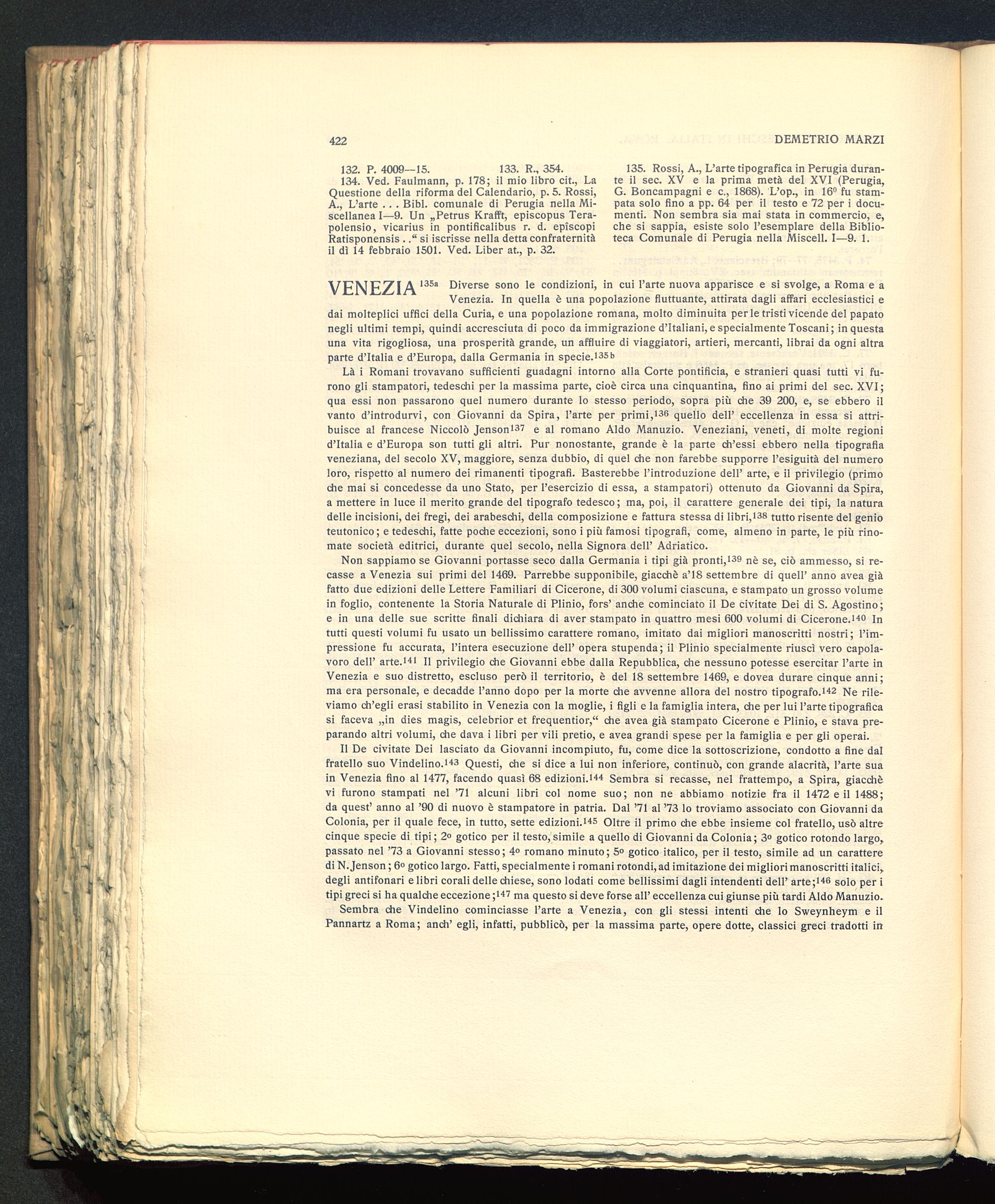 Là i Romani trovavano sufficienti guadagni intorno alla Corte pontificia , e stranieri quasi tutti vi fu-rono gli stampatori, tedeschi per la massima parte, cioè circa una cinquantina, fino ai primi del sec. XVI;qua essi non passarono quel numero durante lo stesso periodo, sopra più che 39 200, e, se ebbero ilvanto d’introdurvi, con Giovanni da Spira, l’arte per primi,>36 quello dell’ eccellenza in essa si attri-buisce al francese Niccolò Jenson 137 e al romano Aldo Manuzio. Veneziani, veneti, di molte regionid’Italia e d’Europa son tutti gli altri. Pur nonostante, grande è la parte ch’essi ebbero nella tipografiaveneziana, del secolo XV, maggiore, senza dubbio, di quel che non farebbe supporre l’esiguità del numeroloro, rispetto al numero dei rimanenti tipografi. Basterebbe l’introduzione dell’ arte, e il privilegio (primoche mai si concedesse da uno Stato, per l’esercizio di essa, a stampatori) ottenuto da Giovanni da Spira,a mettere in luce il merito grande del tipografo tedesco; ma, poi, il carattere generale dei tipi, la naturadelle incisioni, dei fregi, dei arabeschi, della composizione e fattura stessa di libri, >38 tutto risente del genioteutonico; e tedeschi, fatte poche eccezioni, sono i più famosi tipografi, come, almeno in parte, le più rino-mate società editrici, durante quel secolo, nella Signora dell’ Adriatico.