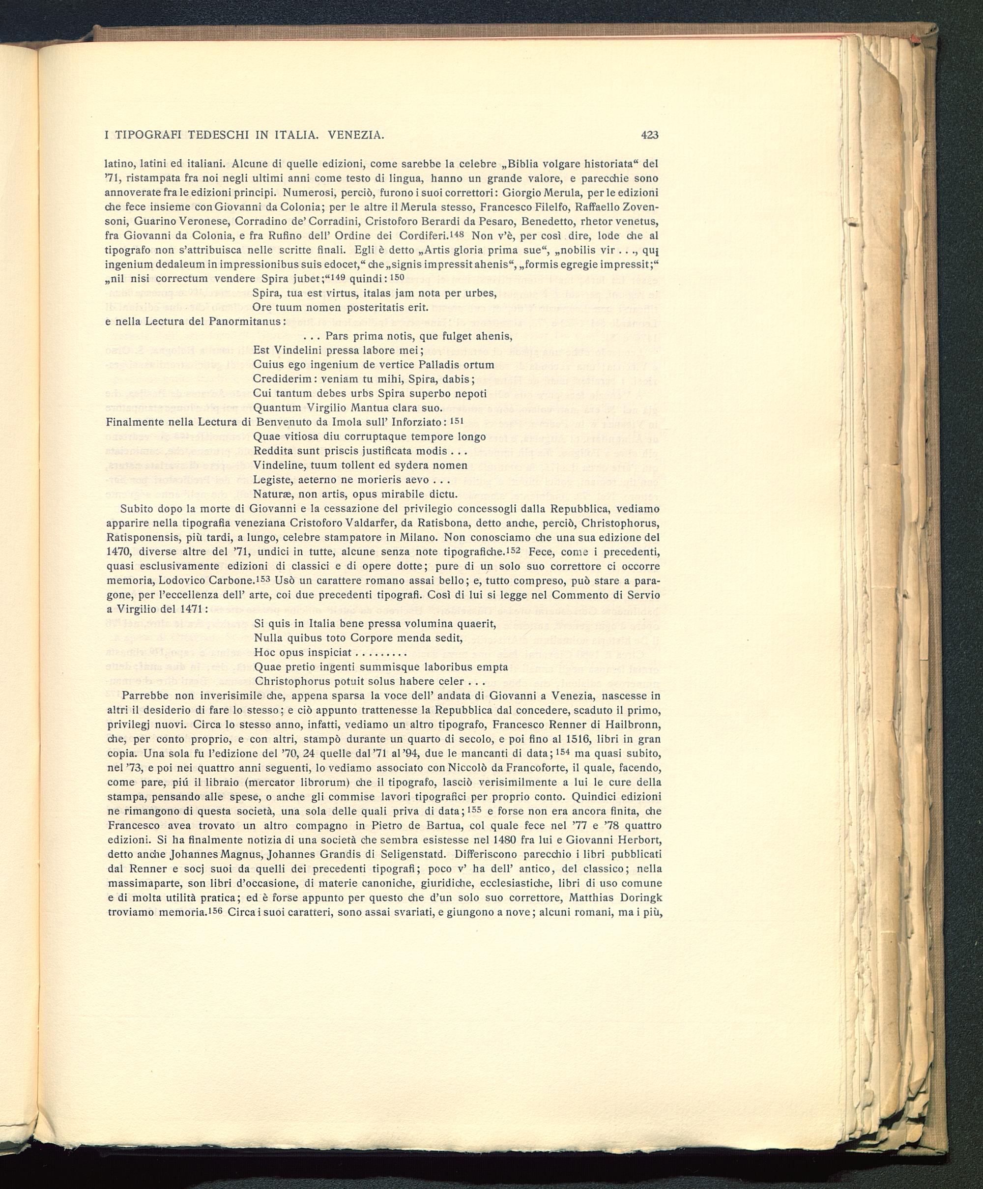 Parrebbe non inverisimile che, appena sparsa la voce dell’ andata di Giovanni a Venezia, nascesse inaltri il desiderio di fare lo stesso; e ciò appunto trattenesse la Repubblica dal concedere, scaduto il primo,privilegi nuovi. Circa lo stesso anno, infatti, vediamo un altro tipografo, Francesco Renner di Hailbronn,che, per conto proprio, e con altri, stampò durante un quarto di secolo, e poi fino al 1516, libri in grancopia. Una sola fu l’edizione del ’70, 24 quelle dal’71 al’94, due le mancanti di data; 154 ma quasi subito,nel’73, e poi nei quattro anni seguenti, lo vediamo associato con Niccolò da Francoforte , il quale, facendo,come pare, più il libraio (mercator librorum) che il tipografo, lasciò verisimilmente a lui le cure dellastampa, pensando alle spese, o anche gli commise lavori tipografici per proprio conto. Quindici edizionine rimangono di questa società, una sola delle quali priva di data; 155 e forse non era ancora finita, cheFrancesco avea trovato un altro compagno in Pietro de Bartua, col quale fece nel ’77 e ’78 quattroedizioni. Si ha finalmente notizia di una società che sembra esistesse nel 1480 fra lui e Giovanni Herbort,detto anche Johannes Magnus , Johannes Grandis di Seligenstatd. Differiscono parecchio i libri pubblicatidal Renner e socj suoi da quelli dei precedenti tipografi; poco v’ ha dell’ antico, del classico; nellamassimaparte, son libri d’occasione, di materie canoniche, giuridiche, ecclesiastiche, libri di uso comunee di molta utilità pratica; ed è forse appunto per questo che d’un solo suo correttore, Matthias Doringktroviamo memoria. 156 Circa i suoi caratteri, sono assai svariati, e giungono a nove ; alcuni romani, ma i più,