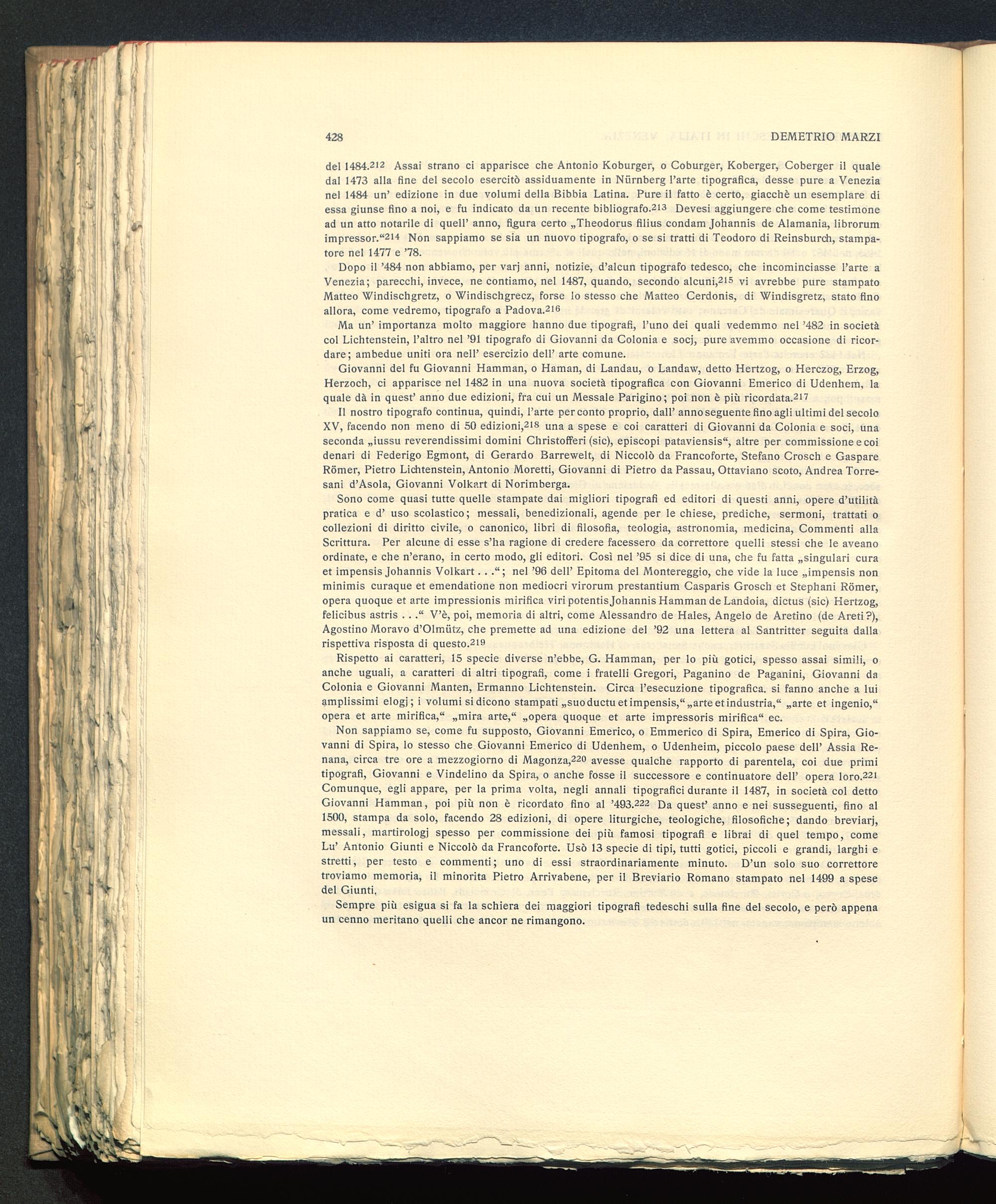 Non sappiamo se, come fu supposto, Giovanni Emerico, o Emmerico di Spira, Emerico di Spira , Gio-vanni di Spira, lo stesso che Giovanni Emerico di Udenhem, o Udenheim , piccolo paese dell’ Assia Re-nana, circa tre ore a mezzogiorno di Magonza , 220 avesse qualche rapporto di parentela, coi due primitipografi, Giovanni e Vindelino da Spira , o anche fosse il successore e continuatore dell’ opera loro. 221Comunque, egli appare, per la prima volta, negli annali tipografici durante il 1487, in società col dettoGiovanni Hamman, poi più non è ricordato fino al ’493. 222 Da quest’ anno e nei susseguenti, fino al1500, stampa da solo, facendo 28 edizioni, di opere liturgiche, teologiche, filosofiche; dando breviari,messali, martirologi spesso per commissione dei più famosi tipografi e librai di quel tempo, comeLu’ Antonio Giunti e Niccolò da Francoforte . Usò 13 specie di tipi, tutti gotici, piccoli e grandi, larghi estretti, per testo e commenti; uno di essi straordinariamente minuto. D’un solo suo correttoretroviamo memoria, il minorità Pietro Arrivabene, per il Breviario Romano stampato nel 1499 a spesedel Giunti.