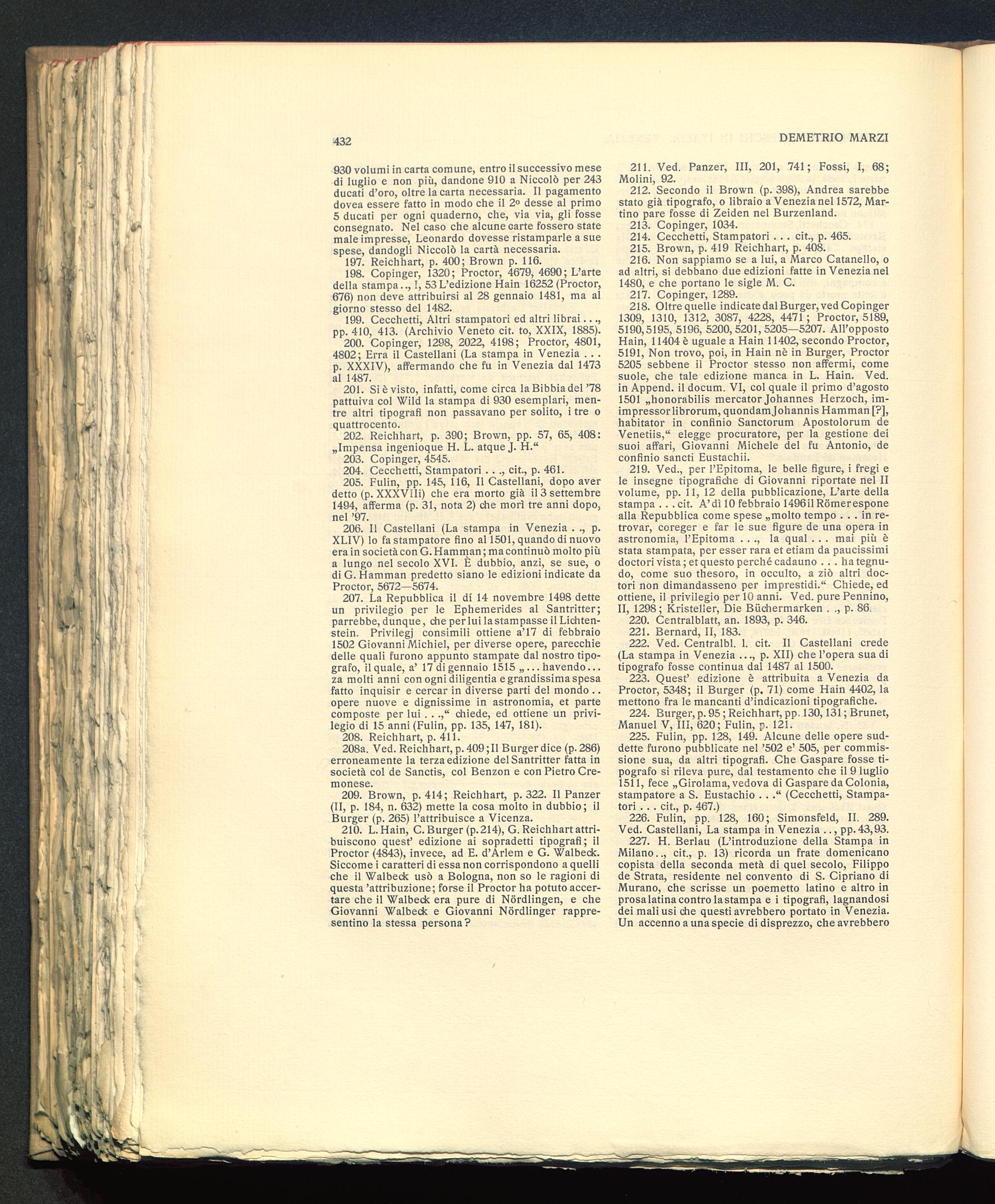 218. Oltre quelle indicate dal Burger, ved Copinger1309, 1310, 1312, 3087, 4228, 4471 ; Proctor, 5189,5190,5195, 5196, 5200,5201,5205—5207. All’oppostoHain, 11404 è uguale a Hain 11402, secondo Proctor,5191, Non trovo, poi, in Hain nè in Burger, Proctor5205 sebbene il Proctor stesso non affermi, comesuole, che tale edizione manca in L. Hain. Ved.in Append. il docum. VI, col quale il primo d’agosto1501 „honorabilis mercator Johannes Herzoch, im-impressorlibrorum, quondamjohannis Hamman [?],habitator in confinio Sanctorum Apostolorum deVenetiis,“ elegge procuratore, per la gestione deisuoi affari, Giovanni Michele del fu Antonio, deconfinio sancti Eustachii.