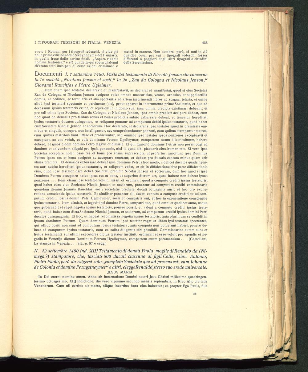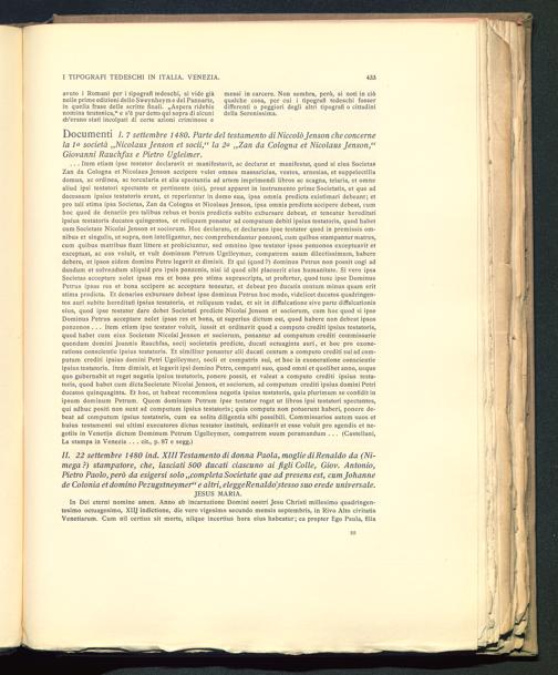 Documenti I. 7 settembre 1480. Parte del testamento di Niccolò Jenson che concernela 1^ società „Nicolaus Jenson et socii,“ la 2& „Zan da Cologna et Nicolaus Jenson,“Giovanni Rauchfas e Pietro Ugleimer.