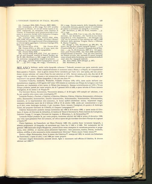 MILANO Sebbene anche nella tipografia milanese i Tedeschi avessero una parte notevole, purenon vi furono comparativamente sì numerosi come a Roma, e a Napoli , nè v’acquistaronofama quanto a Venezia. Anzi la gloria stessa d’aver introdotta qui l’arte loro non spetta, chè non posse-diamo alcuna edizione col nome d’uno fra essi anteriore al 1474. Devesi notare, però, che, fino dal dì 30maggio 1470, un tedesco, rimasto a noi sconosciuto, trattava di venire a Milano con 12 suoi compagni, perimpiantarvi una grande officina tipografica; il che poi non fece. 244