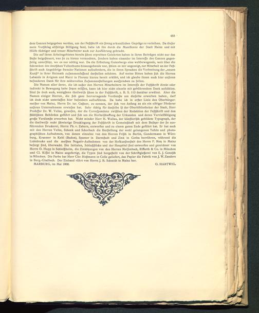 Die Namen aller derer, die ich außer den Herren Mitarbeitern im Intere[(e der Feßfchrift direkt oderindirekt in Bewegung habe feßen müffen, kann ich hier nicht einzeln mit gebührendem Dank aufzählen.Sind fie doch auch, wenigßens theilweife fchon in der Feßfchrift, z. B. S. 113 dankbar erwähnt. Aber dieNamen einiger Herren, die (ich ganz hervorragende Verdiente um diefelbe erworben haben, darfich doch nicht unterlaffen hier befonders aufzuführen. Da habe ich in erßer Linie den Oberbürger-meißer von Mainz, Herrn Dr. iur. Gaßner, zu nennen, der (Ich von Anfang an als ein eifriger Fördererunferes Unternehmens erwiefen hat. Sehr thätig für dasfelbe iß der Oberbibliothekar der Stadt, HerrProfeffor Dr. W. Velke, gewefen, der die Correfpondenz zwifchen der Redaktion der Feßfchrift und denßädtifchen Behörden geführt und (ich um die Herbeifchaffung der Urkunden und deren Vervielfältigunggroße Verdiente erworben hat. Nicht minder Herr H. Wallau, der künßlerifch gebildete Typograph, derdie theilweife recht fchwierige Drucklegung der Feßfchrift in Gemeinfchaft mit dem Beßßer der ße aus-führenden Druckerei, Herrn Ph. v. Zabern, entworfen und zu einem guten Ende geführt hat. Er hat auchmit den Herren Velke, Schenk und Schorbach die Herßellung der wohl gelungenen Tafeln und photo-graphifchen Aufnahmen, von denen einzelne von den Herren Frifch in Berlin, Gundermann in Würz-burg, Kraemer in Kehl (Baden), Spamer in Darmßadt und Zink in Gotha herrühren, während dieLichtdrucke und die meißen Negativ-Aufnahmen von der Hofkunßanßalt des Herrn P. Meß in Mainz beforgt ßnd, überwacht. Die Initialen, Schlußßücke und der Hauptitel ßnd entworfen und gezeichnet vonHerrn O. Hupp in Schleißheim, die Zinkäßungen von den Herren Meifenbach, Riffarth & Co. in München und CI. Kiffel in Mainz angefertigt, die Typen ßnd hergeßellt von der Schriftgießerei von E. J. Genzfchin München. Die Farbe hat Herr Chr. Hoßmann in Celle geliefert, das Papier die Fabrik von J. W. Zandersin Berg.-Gladbach. Der Einband rührt von Herrn J. B. Schmidt in Mainz her.