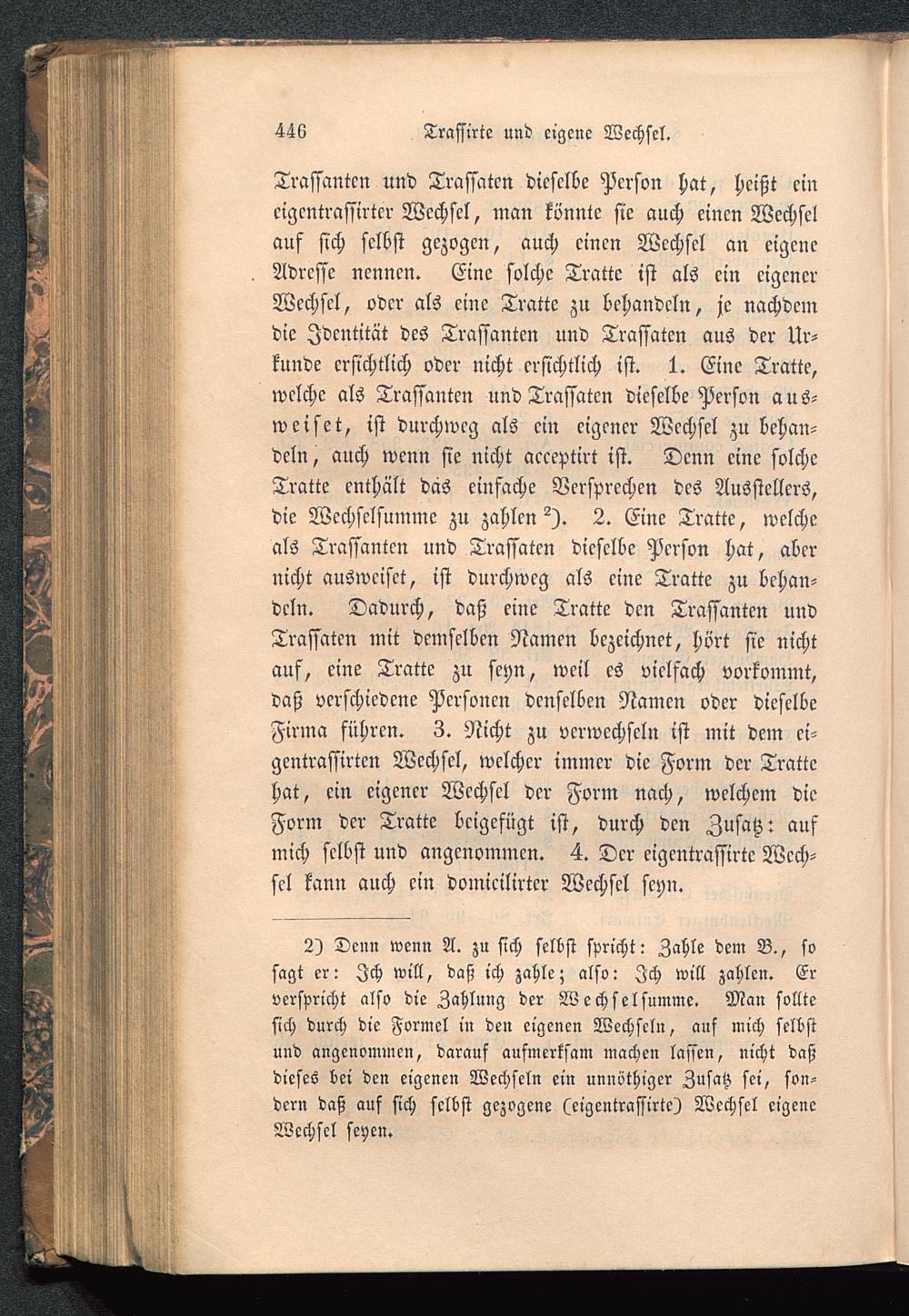 Trassanten und Trassaten dieselbe Person hat, heißt eincigentrassirter Wechsel, man könnte sie auch einen Wechselauf sich selbst gezogen, auch einen Wechsel an eigeneAdresse nennen. Eine solche Tratte ist als ein eigenerWechsel, oder als eine Tratte zu behandeln, je nachdemdie Identität des Trassanten und Trassaten aus der Ur-kunde ersichtlich oder nicht ersichtlich ist. 1. Eine Tratte,welche als Trassanten und Trassaten dieselbe Person aus-weiset, ist durchweg als ein eigener Wechsel zu behan-deln, auch wenn sie nicht acceptirt ist. Denn eine solcheTratte enthält das einfache Versprechen des Ausstellers,die Wechselsumme zu zahlen^). 2. Eine Tratte, welcheals Trassanten und Trassaten dieselbe Person hat, abernicht ausweiset, ist durchweg als eine Tratte zu behan-deln. Dadurch, daß eine Tratte den Trassanten undTrassaten mit demselben Namen bezeichnet, hört sie nichtauf, eine Tratte zu seyn, weil es vielfach vorkommt,daß verschiedene Personen denselben Namen oder dieselbeFirma führen. 3. Nicht zu verwechseln ist mit dem ci-gentrassirten Wechsel, welcher immer die Form der Trattehat, ein eigener Wechsel der Form nach, welchem dieForm der Tratte beigefügt ist, durch den Zusatz: aufmich selbst und angenommen. 4. Der eigentrassirte Wech-sel kann auch ein domicilirter Wechsel seyn.