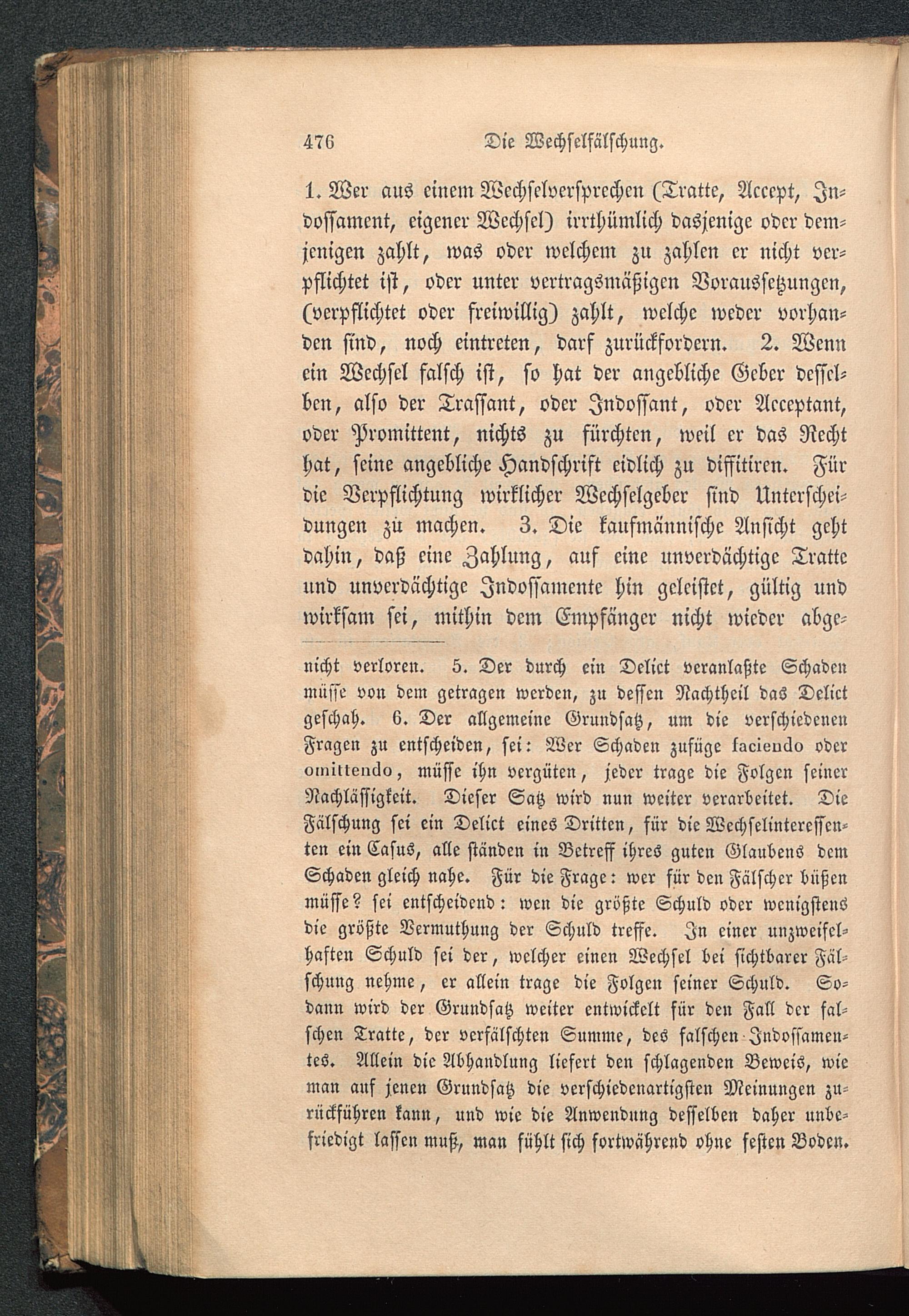 1. Wer aus einem Wechselversprcchen (Tratte, Accept, In-dossament, eigener Wechsel) irrthümlich dasjenige oder dem-jenigen zahlt, was oder welchem zu zahlen er nicht ver-pflichtet ist, oder unter vertragsmäßigen Voraussetzungen,(verpflichtet oder freiwillig) zahlt, welche weder vorhan-den sind, noch eintreten, darf zurückfordern. 2. Wennein Wechsel falsch ist, so hat der angebliche Geber dessel-ben, also der Trassant, oder Indossant, oder Acceptant,oder Promittent, nichts zu fürchten, weil er das Rechthat, seine angebliche Handschrift eidlich zu diffitiren. Fürdie Verpflichtung wirklicher Wechselgeber sind Unterschei-dungen zu machen. 3. Die kaufmännische Ansicht gehtdahin, daß eine Zahlung, auf eine unverdächtige Tratteund unverdächtige Indossamente hin geleistet, gültig undwirksam sei, mithin dem Empfänger nicht wieder abge-locht verloren. 5. Der durch ein Delict veranlaßte Schadenmüsse von dem getragen werden, zu dessen Nachtheil das Delictgeschah. 6. Der allgemeine Grundsatz, um die verschiedenenFragen zu entscheiden, sei: Wer Schaden zufüge lacisucko oderomttteiMo, müsse ihn vergüten, jeder trage die Folgen seinerNachlässigkeit. Dieser Satz wird nun weiter verarbeitet. DieFälschung sei ein Delict eines Dritten, für die Wechseliuteressen-ten ein Casus, alle ständen in Betreff ihres guten Glaubens demSchaden gleich nahe. Für die Frage: wer für den Fälscher büßenmüsse? sei entscheidend: wen die größte Schuld oder wenigstensdie größte Vermuthung der Schuld treffe. In einer unzweifel-haften Schuld sei der, welcher einen Wechsel bei sichtbarer Fäl-schung nehme, er allein trage die Folgen seiner Schuld. So-dann wird der Grundsatz weiter entwickelt für den Fall der fal-schen Tratte, der verfälschten Summe, des falschen Indossamen-tes. Allein die Abhandlung liefert den schlagenden Beweis, wieman auf jenen Grundsatz die verschiedenartigsten Meinungen zu-rückführen kann, und wie die Anwendung desselben daher unbe-friedigt lassen muß, man fühlt sich fortwährend ohne festen Boden.