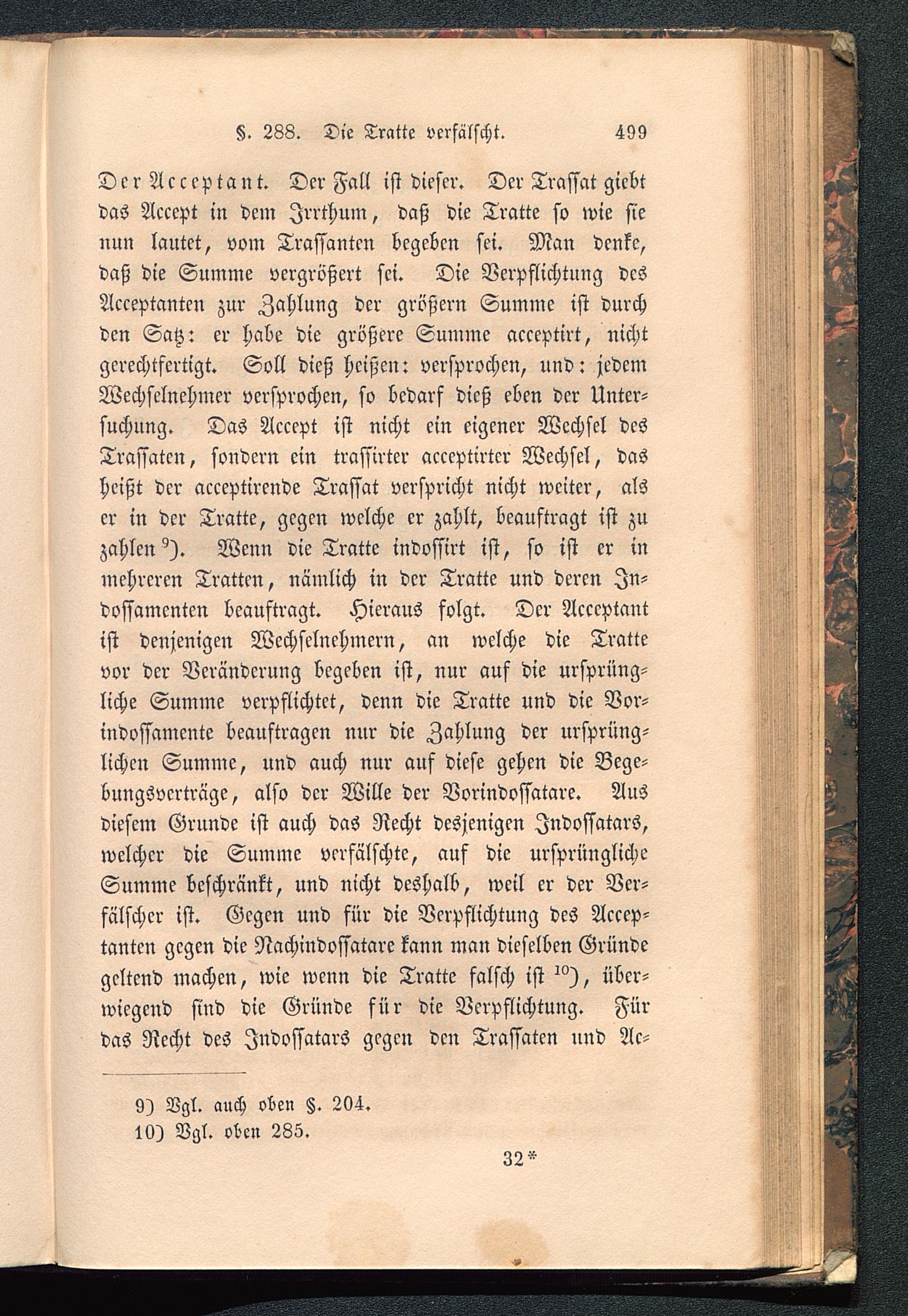 Der Acceptant. Der Fall ist dieser. Der Trassat giebtdas Accept in dem Irrthum, daß die Tratte so wie sienun lautet, vom Trassanten begeben sei. Man denke,daß die Summe vergrößert sei. Die Verpflichtung desAcceptanten zur Zahlung der größern Summe ist durchden Satz: er habe die größere Summe acceptirt, nichtgerechtfertigt. Soll dieß heißen: versprochen, und: jedemWechselnehmer versprochen, so bedarf dieß eben der Unter-suchung. Das Accept ist nicht ein eigener Wechsel desTrassaten, sondern ein trassirter acceptirtcr Wechsel, dasheißt der acceptirende Trassat verspricht nicht weiter, alser in der Tratte, gegen welche er zahlt, beauftragt ist zuzahlen 2). Wenn die Tratte indossirt ist, so ist er inmehreren Tratten, nämlich in der Tratte und deren In-dossamenten beauftragt. Hieraus folgt. Der Acceptantist denjenigen Wechselnehmern, an welche die Trattevor der Veränderung begeben ist, nur auf die ursprüng-liche Summe verpflichtet, denn die Tratte und die Vor-indossamente beauftragen nur die Zahlung der ursprüng-lichen Summe, und auch nur auf diese gehen die Bege-bungsverträge, also der Wille der Vorindossatare. Ausdiesem Grunde ist auch das Recht desjenigen Jndossatarö,welcher die Summe verfälschte, auf die ursprünglicheSumme beschränkt, und nicht deshalb, weil er der Ver-fälscher ist. Gegen und für die Verpflichtung des Accep-tantcn gegen die Nachindossatare kann man dieselben Gründegeltend machen, wie wenn die Tratte falsch ist ^), über-wiegend sind die Gründe für die Verpflichtung. Fürdas Recht des Jndossatarö gegen den Trassaten und Ac-