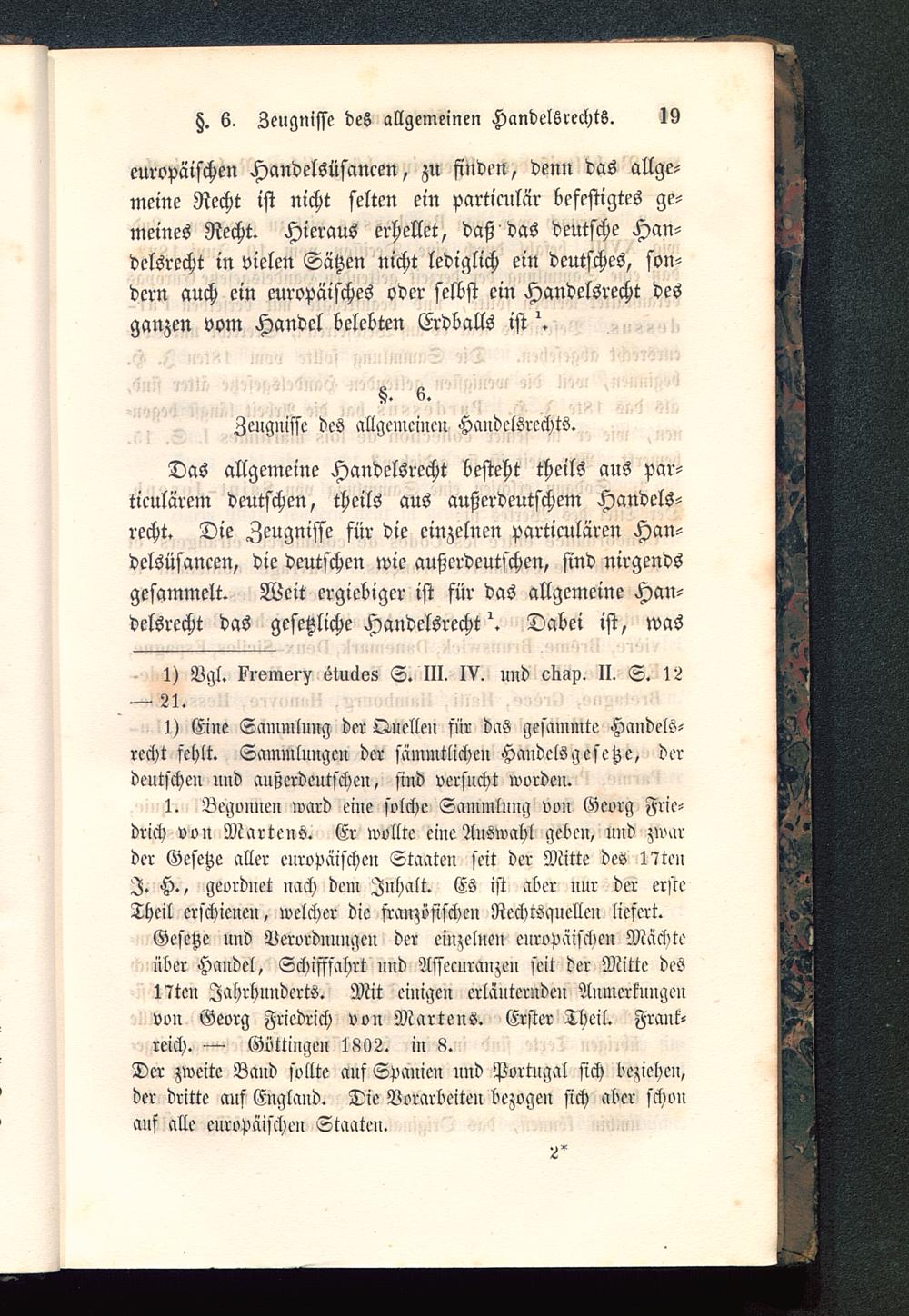 1. Begonnen ward eine solche Sammlung von Georg Frie-drich von Martens . Er wollte eine Auswahl geben, und zwarder Gesetze aller europäischen Staaten seit der Mitte des 17tenI. H., geordnet nach dem Inhalt. Es ist aber nur der ersteTheil erschienen, welcher die französischen Rechtsqnellen liefert.Gesetze und Verordnungen der einzelnen europäischen Mäcbteüber Handel, Schifffahrt und Assccuranzen seit der Mitte des17tcn Jahrhunderts. Mit einigen erläuternden Anmerkungenvon Georg Friedrich von Martens. Erster Theil. Frank-reich . — Gottingen 1802. in 8.