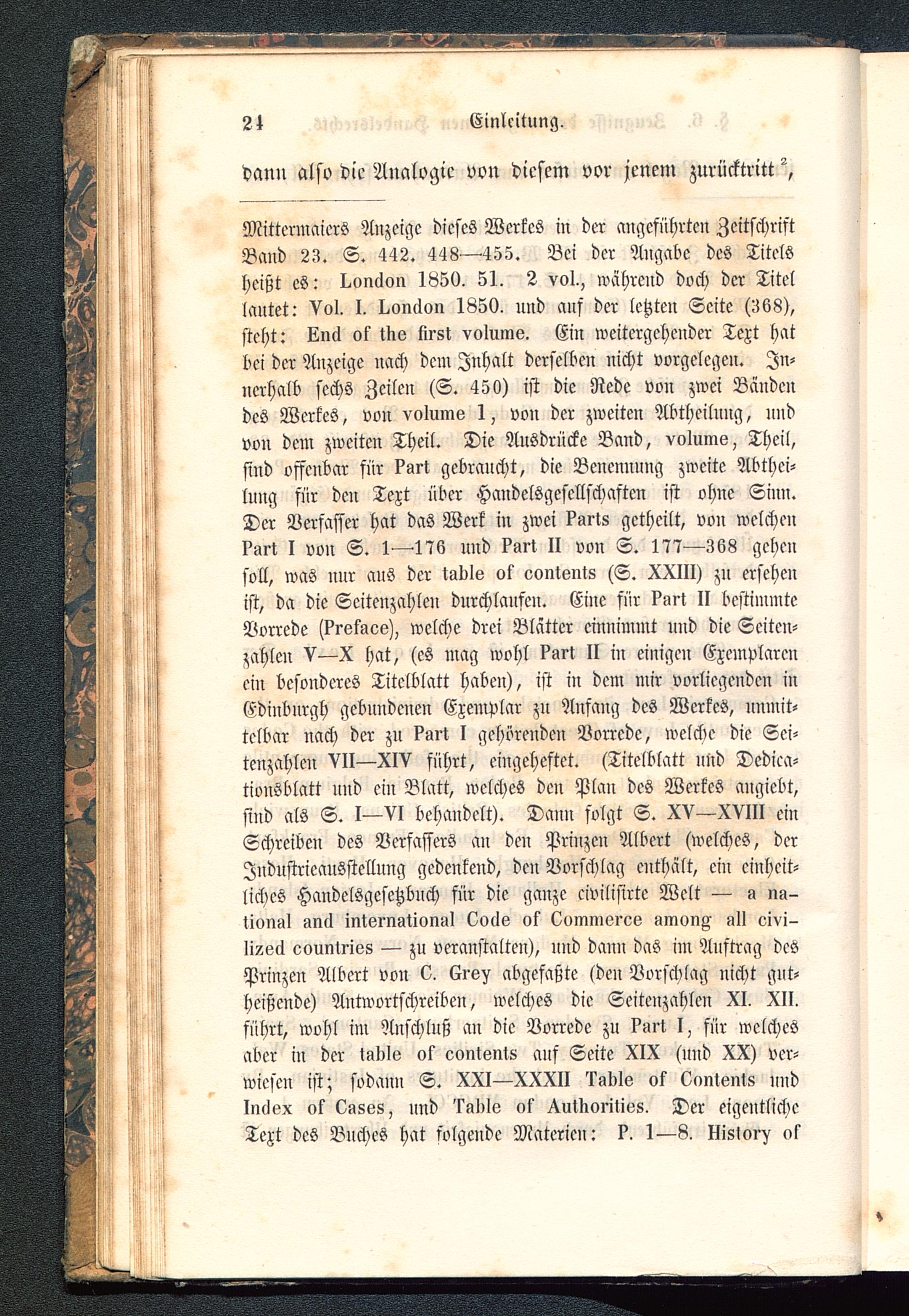 Mittermaiers Anzeige dieses Werkes in der angeführten ZeitschriftBand 23. S. 442. 448—455. Bei der Angade des Titelsheißt es: Onnllon 1650. 51. 2 vol., während doch der Titellautet: Vol. I. Oonclon 1850. und ans der letzten Seite (568),steht: bind ok tbo lirst volumo. Ein weitergehender Text hatdei der Anzeige nach dem Inhalt derselben nicht vorgelegen. In-nerhalb sechs Zeilen (S. 450) ist die Rede von zwei Bändendes Werkes, von volumo 1, von der zweiten Abtheilung, undvon dem zweiten Theil. Die Ausdrücke Band, volumo, Theil,sind offenbar für ?art gebraucht, die Benennung zweite Abthei-lung für den Text über Handelsgesellschaften ist ohne Sinn.Der Verfasser hat das Werk in zwei ?arts getheilt, von welchenPart I von S. 1—176 und ?art II von S. 177—368 gehensoll, was nur aus der tadle ok oontonts (S. XXIII) zu ersehenist, da die Seitenzahlen durchlaufen. Eine für kort II bestimmteVorrede (?rokaeo), welche drei Blätter einnimmt und die Seiten-zahlen V—X hat, (es mag wohl?art II iu einigen Exemplarenein besonderes Titelblatt haben), ist iu dem mir vorliegenden inEdinburgh gebundenen Exemplar zu Ansang des Werkes, unmit-telbar nach der zu ?art I gehörenden Vorrede, welche die Sei-tenzahlen VII—XIV führt, eingeheftet. (Titelblatt »nd Dedica-tionsblatt und ein Blatt, welches den Plan des Werkes angiebt,sind als S. I—VI behandelt). Dann folgt S. XV—XVIII einSchreiben des Versassers an den Prinzen Albert (welches, derIndustrieausstellung gedenkend, den Vorschlag enthält, ein einheit-liches Handelsgesetzbuch für die ganze civilisirte Welt — a na-tional anil international Oollo ok Oommoroo ainon^ a» oivi-Ii?oä oountries — zu veranstalten), und dann das im Auftrag desPrinzen Albert von 0. Ere^ abgefaßte (den Vorschlag nicht gut-heißende) Antwortschreiben, welches die Seitenzahlen XI. XII.führt, wohl im Anschluß an die Vorrede zu I'art I, für welchesaber in der tadlo ok oontonts auf Seite XIX (uud XX) ver-wiesen ist; sodann S. XXI—XXXII ladlo ok Oontonts undInclox ok Oasos, und 'kablo ok Xutdoritios. Der eigentlicheText des Buches hat folgende Materien: ?. 1—8. Hislor^ ok