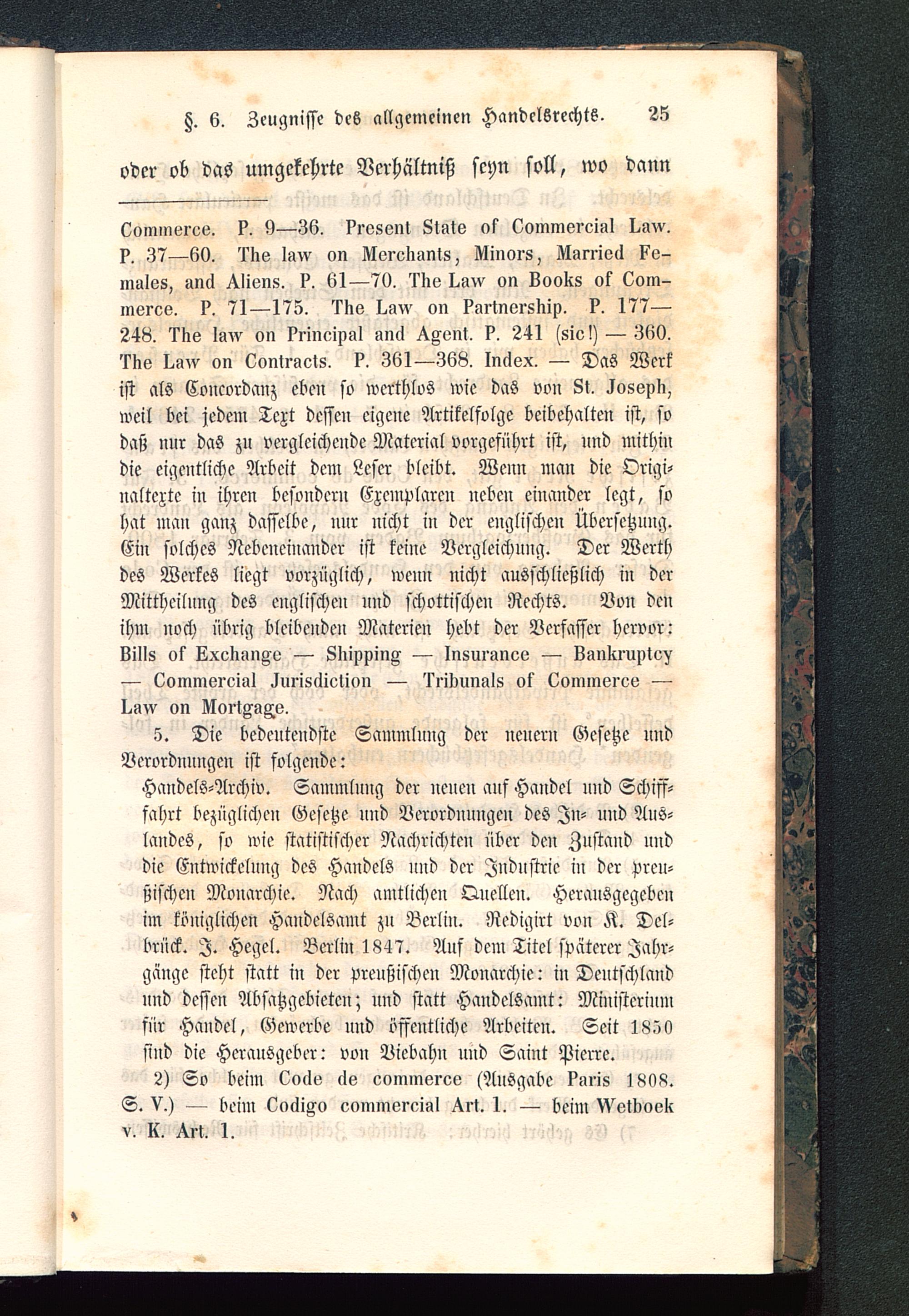 commoroo. ?, 9—36. Lrosont 8tato ok tlommoi'oi-,1 Larv.x 37—60. '1'Iro larv on Norolumts, Ninois, Nnrrioll Lo-malos, i>nä Mons. L. 61—70. Ilro Lnrv on Looks ok dom-moros. L. 71—175. 'kbo Luve' on Lartnorsbip. ?. 177—248. Iko Isrv on Lrinoipal nncl ^ont. ?. 241 jsio!)— -360.'kko Laev on (lontrsots. L. 361—368. Inclox. — Das Wertist als Concordanz eben so werthlos wie das von 8t. losopb,weil bei jedem Text dessen eigene Artikelfolge beibehalten ist, sodaß mir das zu vergleichende Material vorgeführt ist, und mithindie eigentliche Arbeit dem Leser bleibt. Wenn man die Origi-naltexte in ihren besondern Exemplaren neben einander legt, sohat man ganz dasselbe, nur nicht in der englischen Übersetzung.Ein solches Nebeneinander ist keine Vergleichung. Der Werthdes Werkes liegt vorzüglich, wenn nicht ausschließlich in derMittheilung des englischen und schottischen Rechts. Von denihm noch übrig bleibenden Materien hebt der Verfasser hervor:Lills ok LxolmnAo — 8Iiippin^ — Insurmroo — Lmikrupto^— Lommoroml lluriscliotion — 'kribunals ok Oommoroo —Imrv on NortAgAo.