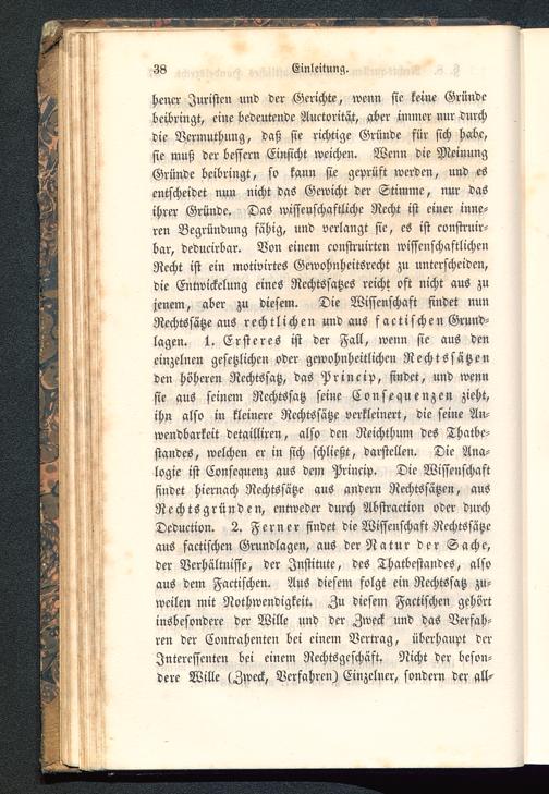hencr Juristen und der Gerichte, wenn sie keine Gründebeibringt, eine bedeutende Auetvrität, aber immer nur durchdie Vermuthung, daß sie richtige Gründe für sich habe,sie muß der bessern Einsicht weichen. Wenn die MeinungGründe beibringt, so kann sie geprüft werden, und esentscheidet nun nicht das Gewicht der Stimme, nur dasihrer Gründe. Das wissenschaftliche Recht ist einer inne-ren Begründung fähig, und verlangt sie, es ist construir-bar, deducirbar. Von einem construirten wissenschaftlichenRecht ist ein motivirtcs Gewohnheitsrecht zu unterscheiden,die Entwickelung eines Rechtssatzes reicht oft nicht aus zujenem, aber zu diesem. Die Wissenschaft findet nunRechtssätze aus rechtlichen und aus factischen Grund-lagen. 1. Ersteres ist der Fall, wenn sie aus deneinzelnen gesetzlichen oder gewohnheitlichen Nechtssätzenden höheren Rechtssatz, das Princip, findet, und wennsie aus seinem Nechtssatz seine Consequenzen zieht,ihn also in kleinere Rechtösätzc verkleinert, die seine An-wendbarkeit detailliren, also den Reichthum des Thatbe-standes, welchen er in sich schließt, darstellen. Die Ana-logie ist Consequenz aus dem Princip. Die Wissenschaftfindet hiernach Nechtssätze aus andern Nechtssätzen, ausRechtsgründen, entweder durch Abstraction oder durchDeduction. 2. Ferner findet die Wissenschaft Rechtssätzeaus factischen Grundlagen, aus der Natur der Sache,der Verhältnisse, der Institute, des Thatbestandes, alsoaus dem Factischen. Aus diesem folgt ein Rechtssatz zu-weilen mit Nothwendigkeit. Zu diesem Factischen gehörtinsbesondere der Wille und der Zweck und das Verfah-ren der Contrahentcn bei einem Vertrag, überhaupt derInteressenten bei einem Rechtsgeschäft. Nicht der beson-dere Wille (Zlveck, Verfahren) Einzelner, sondern dex all-