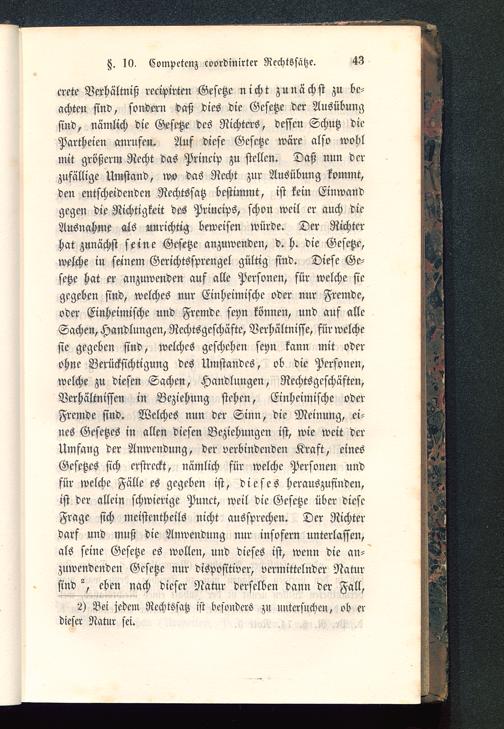 crete Verhältniß recipirten Gesetze nicht zunächst zu be-achten sind, sondern dast dies die Gesetze der Ausübungsind, nämlich die Gesetze des Richters, dessen Schutz diePartheien anrufen. Auf diese Gesetze wäre also wohlmit größerm Recht das Princip zu stellen. Daß nun derzufällige Umstand, wo das Recht zur Ausübung kommt,den entscheidenden Rechtssatz bestimmt, ist kein Einwandgegen die Richtigkeit des Princips, schon weil er auch dieAusnahme als unrichtig beweisen würde. Der Richterhat zunächst seine Gesetze anzuwenden, d. h. die Gesetze,welche in seinem Gerichtssprengel gültig sind. Diese Ge-setze hat er anzuwenden auf alle Personen, für welche siegegeben sind, welches nur Einheimische oder nur Fremde,oder Einheimische und Fremde seyn können, und auf alleSachen, Handlungen, Rechtsgeschäfte, Verhältnisse, für welchesie gegeben sind, welches geschehen seyn kann mit oderohne Berücksichtigung des Umstandes, ob die Personen,welche zu diesen Sachen, Handlungen, Rechtsgeschäften,Verhältnissen in Beziehung stehen, Einheimische oderFremde sind. Welches nun der Sinn, die Meinung, ei-nes Gesetzes in allen diesen Beziehungen ist, wie weit derUmfang der Anwendung, der verbindenden Kraft, einesGesetzes sich erstreckt, nämlich für welche Personen undfür welche Fälle es gegeben ist, dieses herauszufinden,ist der allein schwierige Punct, weil die Gesetze über dieseFrage sich meistentheils nicht aussprechen. Der Richterdarf und muß die Anwendung nur insofern unterlassen,als seine Gesetze es wollen, und dieses ist, wenn die an-zuwendenden Gesetze nur dispositivcr, vermittelnder Natursind eben nach dieser Natur derselben dann der Fall,