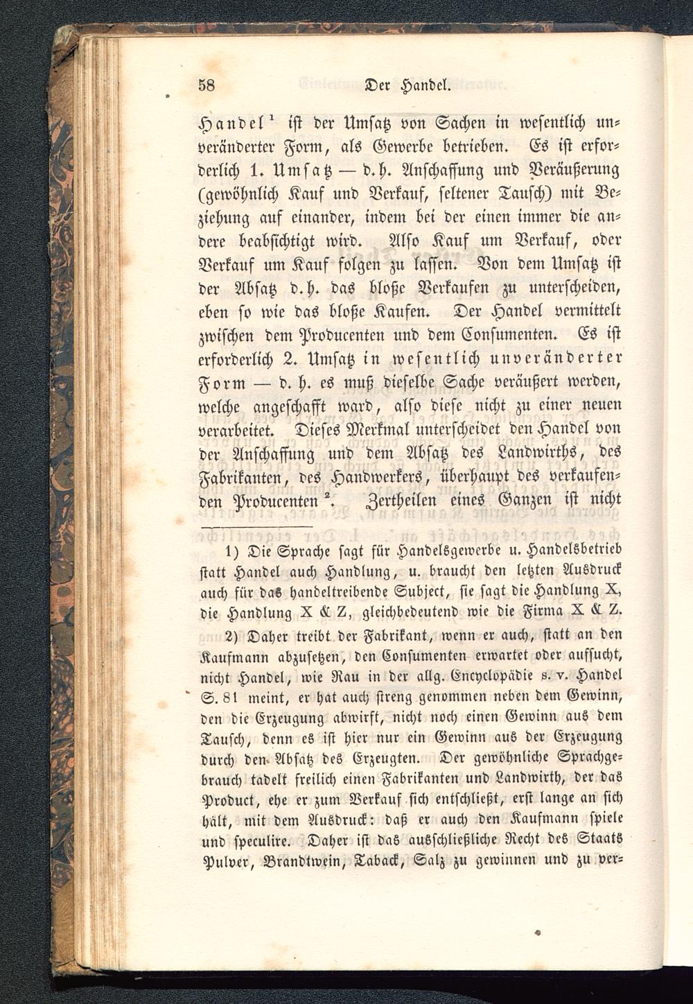 Handel" ist der Umsatz von Sachen in wesentlich un-veränderter Form, als Gewerbe betrieben. Es ist erfor-derlich 1. Umsatz — d.h. Anschaffung und Veräußerung(gewöhnlich Kauf und Verkauf, seltener Tausch) mit Be-ziehung auf einander, indem bei der einen immer die an-dere beabsichtigt wird. Also Kauf um Verkauf, oderVerkauf um Kauf folgen zu lassen. Von dem Umsatz istder Absatz d.h. das bloße Verkaufen zu unterscheiden,eben so wie das bloße Kaufen. Der Handel vermitteltzwischen dem Producenten und dem Consumentcn. Es isterforderlich 2. Umsatz in wesentlich unveränderterForm — d. h. es muß dieselbe Sache veräußert werden,welche angeschafft ward, also diese nicht zu einer neuenverarbeitet. Dieses Merkmal unterscheidet den Handel vonder Anschaffung und dem Absatz des Landwirths, desFabrikanten, des Handwerkers, überhaupt des verkaufen-den Producenten Zertheilen eines Ganzen ist nicht