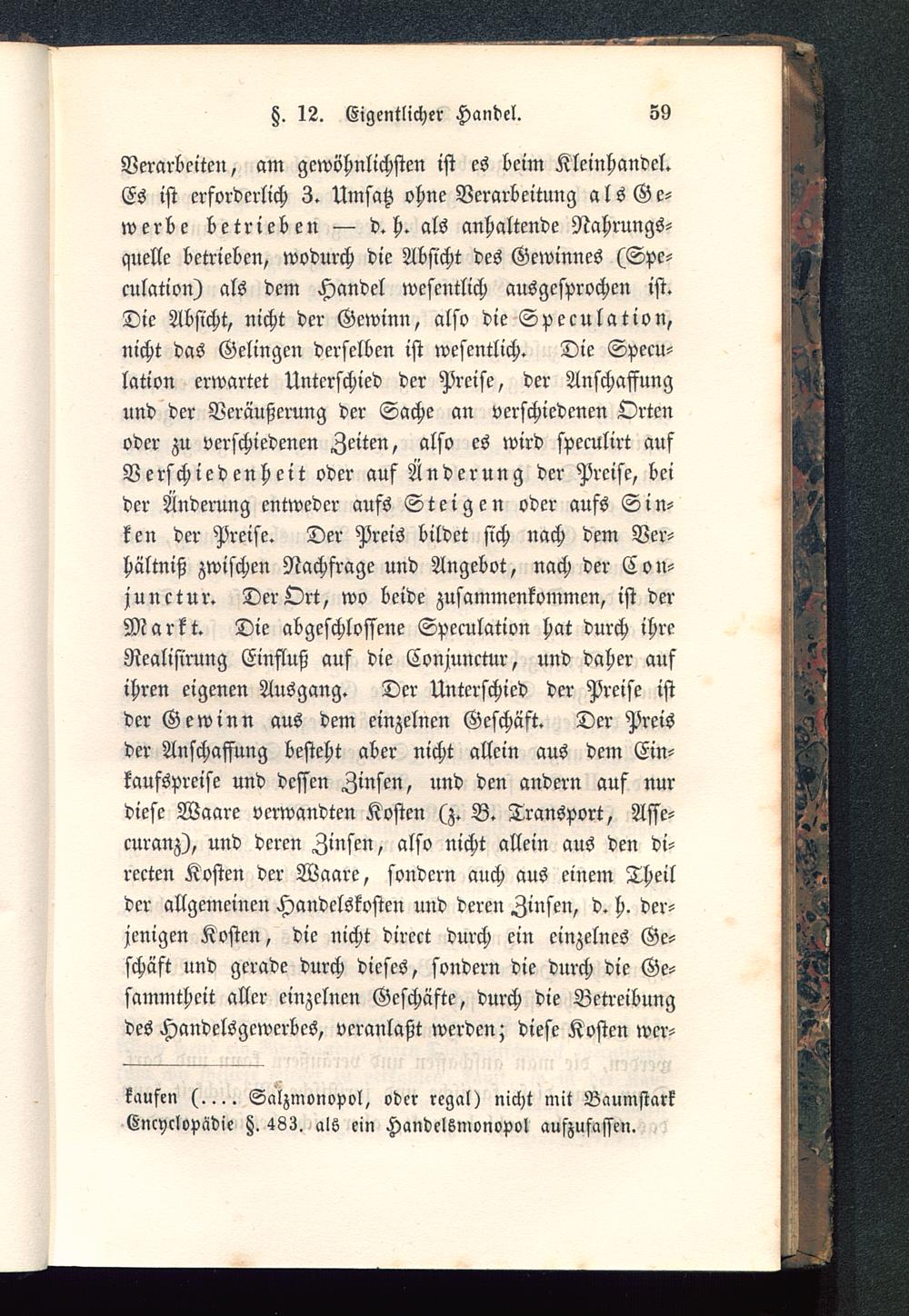 Verarbeiten, am gewöhnlichsten ist es beim Kleinhandel.Es ist erforderlich 3. Umsatz ohne Verarbeitung als Ge-werbe betrieben — d.h. als anhaltende Nahrungs-quelle betrieben, wodurch die Absicht des Gewinnes (Spe-kulation) als dem Handel wesentlich ausgesprochen ist.Die Absicht, nicht der Gewinn, also die Speculation,nicht das Gelingen derselben ist wesentlich. Die Specu-lation erwartet Unterschied der Preise, der Anschaffungund der Veräußerung der Sache an verschiedenen Ortenoder zu verschiedenen Zeiten, also es wird speculirt aufVerschiedenheit oder auf Änderung der Preise, beider Änderung entweder aufs Steigen oder aufs Sin-ken der Preise. Der Preis bildet sich nach dem Ver-hältniß zwischen Nachfrage und Angebot, nach der C on-junctur. Der Ort, wo beide zusammenkommen, ist derMarkt. Die abgeschlossene Speculation hat durch ihreNealisirung Einfluß auf die Conjunctur, und daher aufihren eigenen Ausgang. Der Unterschied der Preise istder Gewinn aus dem einzelnen Geschäft. Der Preisder Anschaffung besteht aber nicht allein aus dem Ein-kaufspreise und dessen Zinsen, und den andern auf nurdiese Waare verwandten Kosten (z. B. Transport, Asse-curanz), und deren Zinsen, also nicht allein aus den di-rekten Kosten der Waare, sondern auch aus einem Theilder allgemeinen Handelskosten und deren Zinsen, d. h. der-jenigen Kosten, die nicht direct durch ein einzelnes Ge-schäft und gerade durch dieses, sondern die durch die Ge-sammtheit aller einzelnen Geschäfte, durch die Betreibungdes Handelsgewerbes, veranlaßt werden; diese Kosten »ver-