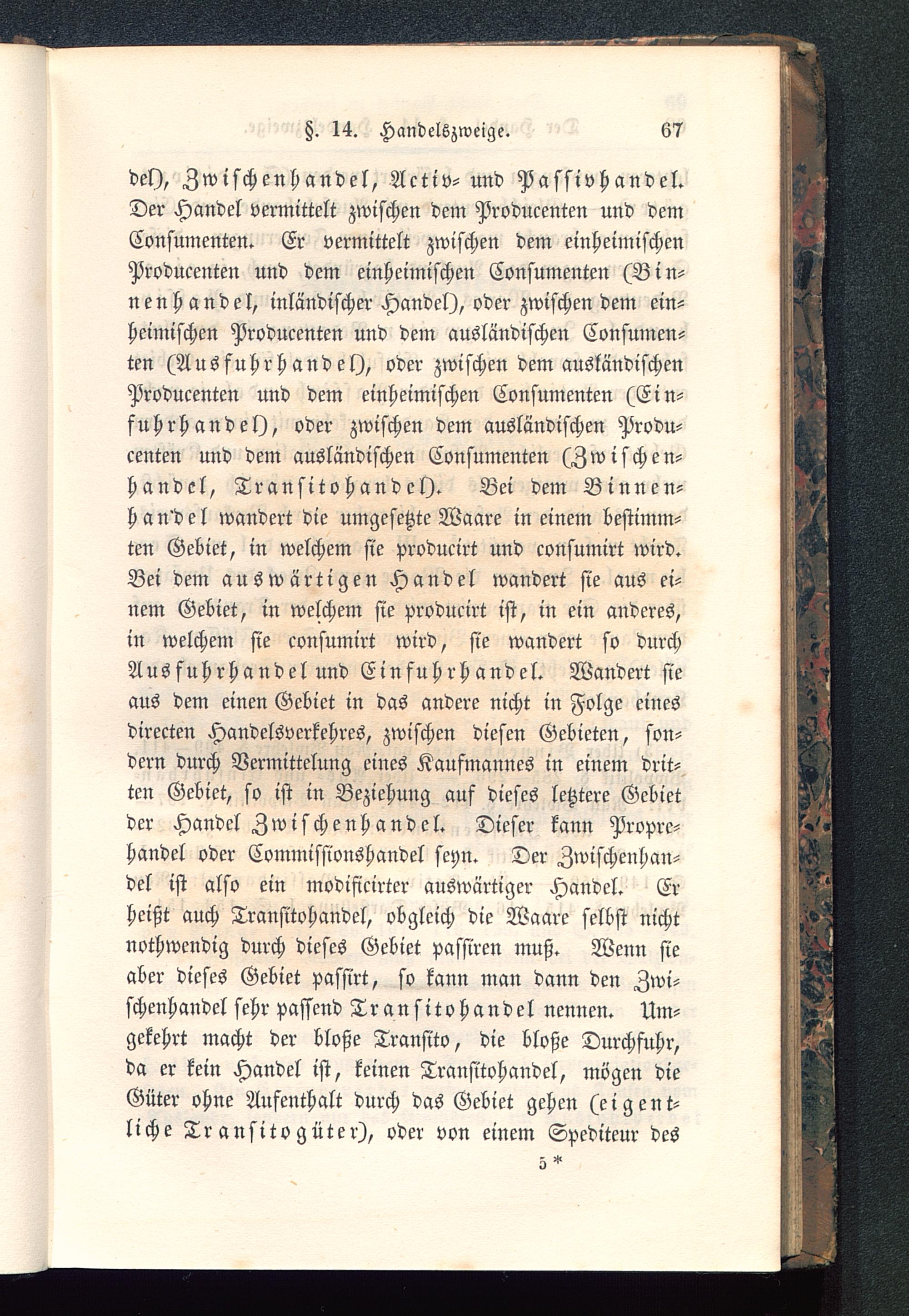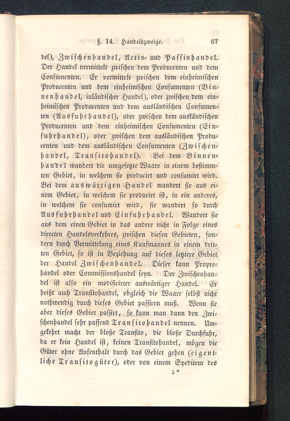 del), Zwischenhandel, Activ- und Passivhandel.Der Handel vermittelt zwischen dem Producenten und demConsumenten. Er vermittelt zwischen dem einheimischenProducenten und dem einheimischen Consumenten (Bin-nenhandel, inländischer Handel), oder zwischen dem ein-heimischen Producenten und dem ausländischen Consumen-ten (Ausfuhrhandel), oder zwischen dem ausländischenProducenten und dem einheimischen Consumenten (Ein-fuhrhandel), oder zwischen dem ausländischen Produ-centen und dem ausländischen Consumenten (Zwischen-handel, Transitohandcl). Bei dem Binnen-handel wandert die umgesetzte Waare in einem bestimm-ten Gebiet, in welchem sie producirt und consumirt wird.Bei dem auswärtigen Handel wandert sie aus ei-nem Gebiet, in welchem sie producirt ist, in ein anderes,in welchem sie consumirt wird, sie wandert so durchAusfuhrhandel und Einfuhrh andel. Wandert sieaus dem einen Gebiet in das andere nicht in Folge einesdirecten Handelsverkehres, zwischen diesen Gebieten, son-dern durch Vermittelung eines Kaufmannes in einem drit-ten Gebiet, so ist in Beziehung auf dieses letztere Gebietder Handel Zwischenhandel. Dieser kann Proprc-handel oder Commissionshandel seyn. Der Zwischenhan-del ist also ein modificirter auswärtiger Handel. Erheißt auch Transitohandcl, obgleich die Waare selbst nichtnothwendig durch dieses Gebiet passiren muß. Wenn sieaber dieses Gebiet passirt, so kann man dann den Zwi-schenhandel sehr passend Transitohandcl nennen. Um-gekehrt macht der bloße Transito, die bloße Durchfuhr,da er kein Handel ist, keinen Transitohandcl, mögen dieGüter ohne Aufenthalt durch das Gebiet gehen (eigent-liche Tr ansito guter), oder von einem Spediteur des