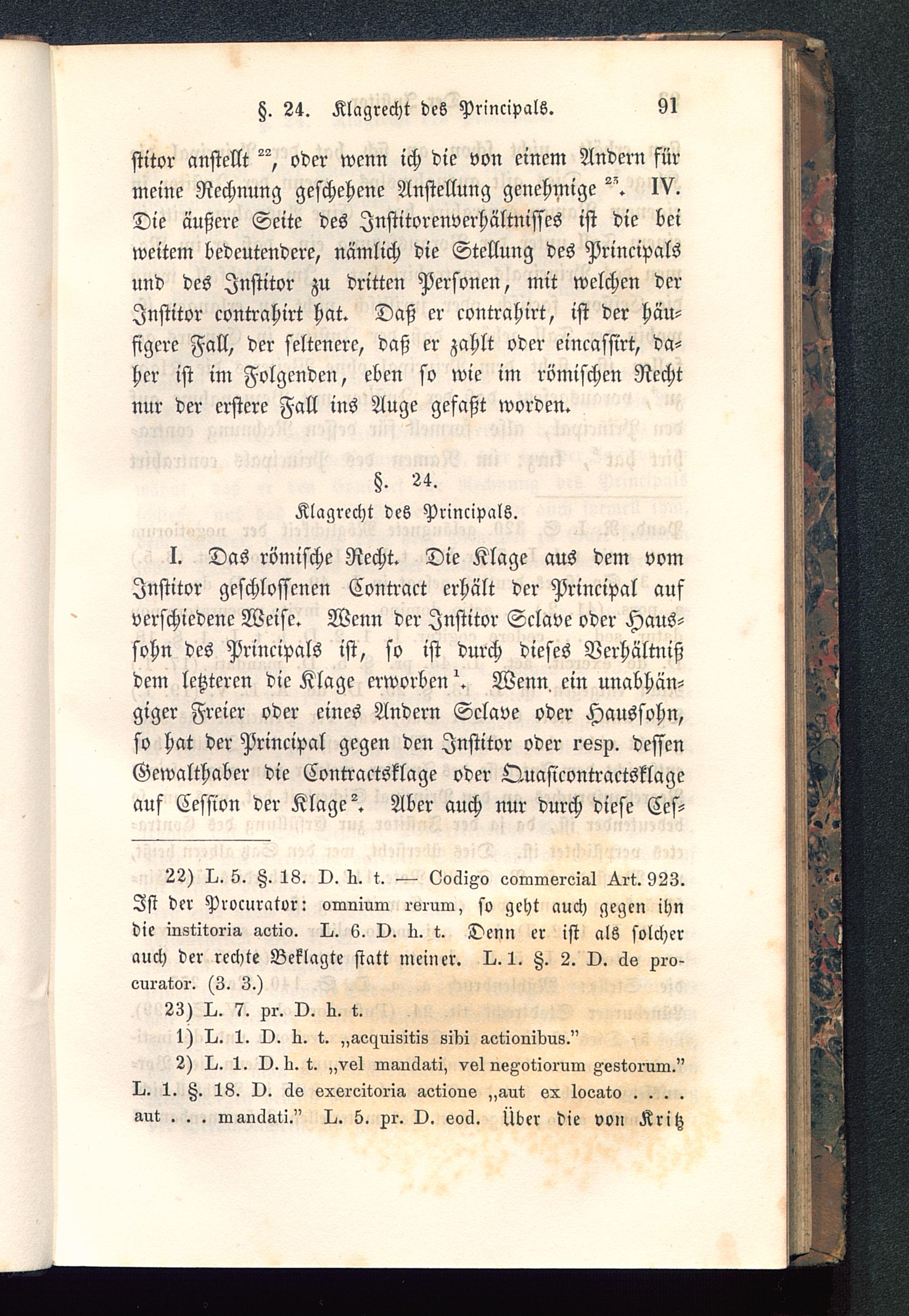 I. Das römische Recht. Die Klage aus dem vomJnstitor geschlossenen Contract erhält der Principal aufverschiedene Weise. Wenn der Jnstitor Sclave oder Haus-sohn des Principals ist, so ist durch dieses Verhältnißdem letzteren die Klage erworbenWenn, ein unabhän-giger Freier oder eines Andern Sclave oder Haussohn,so hat der Principal gegen den Jnstitor oder resp, dessenGewalthaber die Contractsklage oder Dmafieontractsklageauf Session der Klaget Aber auch nur durch diese Ces-