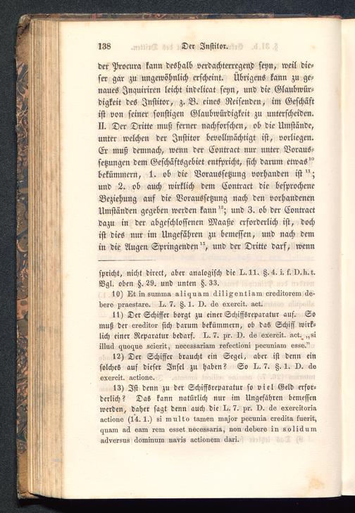 der Procura kann deshalb verdachterregen.d seyn, weil die-ser gar zu ungewöhnlich erscheint. Übrigens kann zu ge-naues Jnquiriren leicht indelicat seyn, und die Glaubwür-digkeit des Jnstitor, z. B. eines Reisenden, im Geschäftist von seiner sonstigen Glaubwürdigkeit zu unterscheiden.II. Der Dritte muß ferner nachforschen, ob die Umstände,unter welchen der Jnstitor bevollmächtigt ist, vorliegen.Er muß demnach, wenn der Contract nur unter Voraus-setzungen dem Geschäftsgebiet entspricht, sich darum etwas"bekümmern, 1. ob die Voraussetzung vorhanden ist";und 2. ob auch wirklich dem Contract die besprocheneBeziehung auf die Voraussetzung nach den vorhandenenUmständen gegeben werden kann"; und 3. ob der Contractdazu in der abgeschlossenen Maaße erforderlich ist, dochist dies nur im Ungefähren zu bemessen, und nach demin die Augen Springenden", und der Dritte darf, wenn