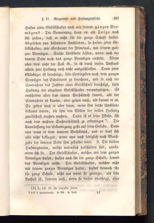 Haftet jeder Gesellschafter auch mit seinem ganzen Ver-mögen? Die Verneinung kann es als Folge nachsich ziehen, daß er nicht für die ganze Schuld haftet.Abgesehen von besondern Umständen, so haftet jeder Ge-sellschafter, wie überhaupt der Principal, mit seinem gan-zen Vermögen. Solche Umstände fehlen, wenn auch derinnern Seite nach das ganze Vermögen einsteht. Wennaber dies nicht der Fall ist, so ist durch diesen Umstandallein jene Haftung noch nicht ausgeschlossen. Denn jederGläubiger ist berechtigt, sein Creditgeben nach dem ganzenVermögen des Schuldners zu berechnen, und so auch derContrahent des Jnstitor einer Gesellschaft berechtigt, dieseHaftung der einzelnen Gesellschafter vorauszusetzen. Esentscheidet aber das innere Verhältniß soweit, als derContrahent es kannte, oder gelten muß, als kannte er es.So gelten muß er aber dann, wenn ihm solche Umständebekannt waren, die ihm den Willen der vollen Haftungzweifelhaft machen mußten. Dann ist es seine Pflicht, sichnach dem wahren Sachverhältniß zu erkundigen DieUnterlassung der Erkundigung geht auf seine Gefahr. Dennnun traut er dem inneren Verhältniß, und er darf sichalso nicht beklagen, wenn nun auch lediglich nach Maaß-gabe der inneren Seite ihm gehaftet wird. 3. Die beidenHaftungsarten, welche wesentlich verschieden sind, combi-niren sich so. Der Gesellschafter, welcher mit dem ganzenVermögen haftet, haftet auch für die ganze Schuld, soweitdas Vermögen reicht. Der Gesellschafter, welcher nichtmit seinem ganzen Vermögen haftet, haftet dennoch fürdie ganze Schuld, nicht nur wenn sie geringer, als seinAntheil ist, sondern auch, wenn sie diesen übersteigt, aber