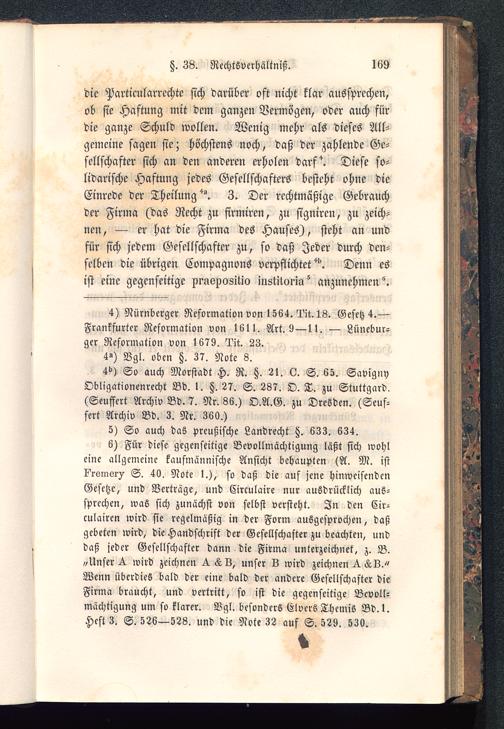 die Particularrechte sich darüber oft nicht klar aussprechen,ob sie Hastung mit dem ganzen Vermögen, oder auch fürdie ganze Schuld wollen. Wenig mehr als dieses All-gemeine sagen sie; höchstens noch, daß der zahlende Ge-sellschafter sich an den anderen erholen darf^. Diese so-lidarische Haftung jedes Gesellschafters besteht ohne dieEinrede der Theilung^. 3. Der rechtmäßige Gebrauchder Firma (das Recht zu firmiren, zu signiren, zu zeich-nen, — er hat die Firma des Hauses), steht an undfür sich jedem Gesellschafter zu, so daß Jeder durch den-selben die übrigen Compagnons verpflichtet^. Denn esist eine gegenseitige praopositw inslitoria^ anzunehmend