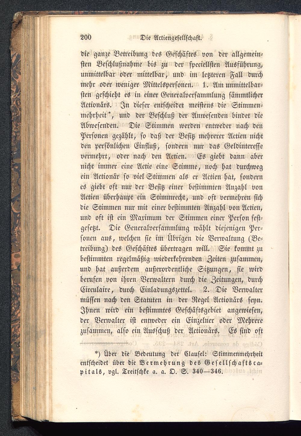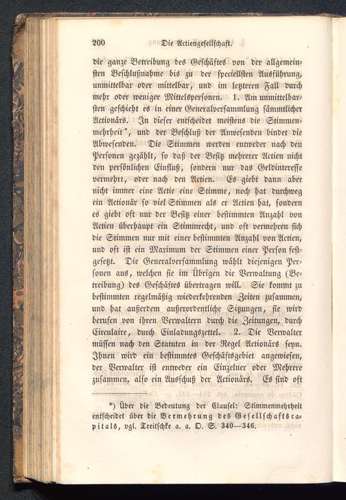 die ganze Betreibung des Geschäftes von der allgemein-sten Beschlußnahme bis zu der speciellsten Ausführung,unmittelbar oder mittelbar, und im letzteren Fall durchmehr oder weniger Mittelspersonen. 1. Am unmittelbar-sten geschieht es in einer Generalversammlung sämmtlicherActionärs. In dieser entscheidet meistens die Stimmen-mehrheit"', und der Beschluß der Anwesenden bindet dieAbwesenden. Die Stimmen werden entweder nach denPersonen gezählt, so daß der Besitz mehrerer Actien nichtden persönlichen Einfluß, sondern nur das Geldinteressevermehrt, oder nach den Actien. Es giebt dann abernicht immer eine Actie eine Stimme, noch hat durchwegein Aktionär so viel Stimmen als er Actien hat, sondernes giebt oft nur der Besitz einer bestimmten Anzahl vonActien überhaupt ein Stimmrecht, und oft vermehren sichdie Stimmen nur mit einer bestimmten Anzahl von Actien,und oft ist ein Maximum der Stimmen einer Person fest-gesetzt. Die Generalversammlung wählt diejenigen Per-sonen aus, welchen sie im Übrigen die Verwaltung (Be-treibung) des Geschäftes übertragen will. Sie kommt zubestimmten regelmäßig wiederkehrenden Zeiten zusammen,und hat außerdem außerordentliche Sitzungen, sie wirdberufen von ihren Verwaltern durch die Zeitungen, durchCirculaire, durch Einladungszettel. 2. Die Verwaltermüssen nach den Statuten in der Regel Actionärs seyn.Ihnen wird ein bestimmtes Geschäftsgebiet angewiesen,der Verwalter ist entweder ein Einzelner oder Mehrerezusammen, also ein Ausschuß der Actionärs. Es sind oft
