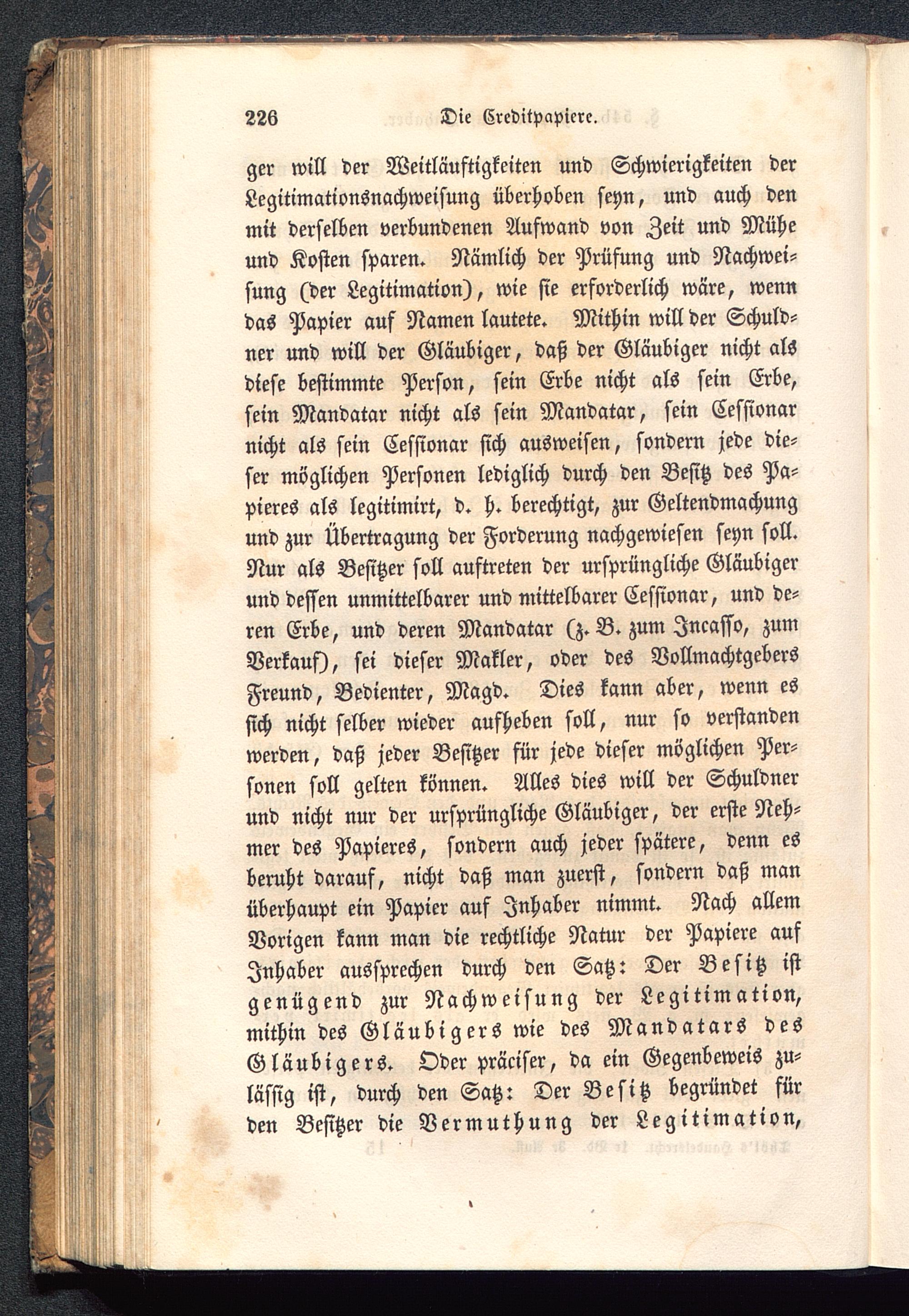 ger will der Weitläufigkeiten und Schwierigkeiten derLegitimationsnachweisung überhoben seyn, und auch denmit derselben verbundenen Aufwand von Zeit und Müheund Kosten sparen. Nämlich der Prüfung und Nachwei-sung (der Legitimation), wie sie erforderlich wäre, wenndas Papier auf Namen lautete. Mithin will der Schuld-ner und will der Gläubiger, daß der Gläubiger nicht alsdiese bestimmte Person, sein Erbe nicht als sein Erbe,sein Mandatar nicht als sein Mandatar, sein Cessionarnicht als sein Cessionar sich ausweisen, sondern jede die-ser möglichen Personen lediglich durch den Besitz des Pa-pieres als legitimirt, d. h. berechtigt, zur Geltendmachungund zur Übertragung der Forderung nachgewiesen seyn soll.Nur als Besitzer soll auftreten der ursprüngliche Gläubigerund dessen unmittelbarer und mittelbarer Cessionar, und de-ren Erbe, und deren Mandatar (z. B. zum Jncasso, zumVerkauf), sei dieser Makler, oder des VollmachtgebersFreund, Bedienter, Magd. Dies kann aber, wenn essich nicht selber wieder aufheben soll, nur so verstandenwerden, daß jeder Besitzer für jede dieser möglichen Per-sonen soll gelten können. Alles dies will der Schuldnerund nicht nur der ursprüngliche Gläubiger, der erste Neh-mer des Papieres, sondern auch jeder spätere, denn esberuht darauf, nicht daß man zuerst, sondern daß manüberhaupt ein Papier auf Inhaber nimmt. Nach allemVorigen kann man die rechtliche Natur der Papiere ausInhaber aussprechen durch den Satz: Der Besitz istgenügend zur Nachweisung der Legitimation,mithin des Gläubigers wie des Mandatars desGläubigers. Oder präciser, da ein Gegenbeweis zu-lässig ist, durch den Satz: Der Besitz begründet fürden Besitzer die Vermuthung der Legitimation,