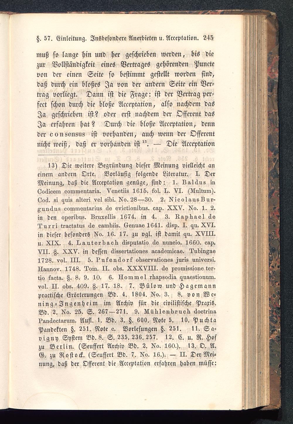 13) Die weitere Begründung dieser Meinung vielleicht aneinem andern Orte. Vorläufig folgende Literatur. I. DerMeinung, daß die Acceptation genüge, sind: 1. Laläus in(loäiosin oominontnrin. Vonstiis 1615. toi. X. VI. (Xnltnm).Ooä. si gnis altori vsl oidi. Xo. 28—30. 2. XioolansLur-Aunclus oommsntarins äs sviotionidn8. oax. XXV. Xo. 1. 2.in den o^sridus. Lrnxsllis 1674. in 4. 3. Rapliael, äsNnrii traotntno äs eainliiis. Xsnnns 1641. clisx. I. gn. XVI.in dieser besonders Xo. 16. 17. zu vgl. ist damit gn. XVIII.U. XIX. 4. Xantsrlinsli äisjintntio äs nnnoio. 1660. oax.VII. 3. XXV. in dessen äiossrtationso nonäsmisas. NndillAns1728. vol. III. 5. Vnksnäort odssi-vationss )nri8 univsrsi.Xnnnov. 1748. IVin. II. ods. XXXVIII. äs xromi88ions tor-tio lastn. Z. 8. 9. 10. 6. Xommsl rdnxooäin c^nnsstionum.vol. II. ods. 409. H. 17. 18. 7. Bülow und Hagemannpractische Erörterungen Bd. 4. 1894. Xo. 3. 3. von We-il ing-Zngenheim im Archiv für die civilistische Praxis.Bd. 2. Xo. 25. <I. 267 — 271. 9. Aülilsndi'noli äootriunXanäsotarum. Aufl. 1. Bd. 3. H. 699. Note 5. 19. PuchtaPandekten tz. 251. Note e. Vorlesungen tz. 251. 11. S a-vigny System Bd. 8. S. 235.236.257. 12. C. u. R. Hofzu Berlin . (Seuffert Archiv Bd. 2. Xo. 160.). 13. O. A.G. zu Rostock. (Seuffert Bd. 7. Xo. 16.). — II. Der Mei-nung, daß der Offerent die Acceptation erfahren haben müsse: