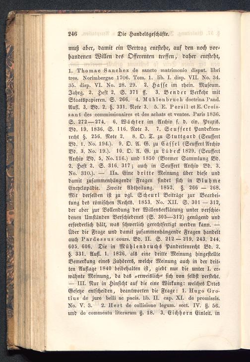 2. Heft 2. S. 316. 317; auch in Seuffert Archiv Bd. 3.Ho. 310.). — Ha. Eine dritte Meinung über diese unddamit zusammenhängende Fragen findet sich in BluhmeEncyclopädie. Zweite Abtheilung. 1852. H. 266 — 263.Mit derselben ist zu vgl. Scheurl Beiträge zur Bearbei-tung des römischen Rechts. 1353. Xo. XII. S. 361 — 312,der aber zur Vollendung der Willenserklärung unter verschie-denen Umständen Verschiedenes (S. 365—312) genügend underforderlich hält, was schwerlich gerechtfertigt werden kann. —Über die Frage und damit zusammenhängende Fragen handeltauch Xarilsssus eonrs. Bd. II. S- 212 — 219. 243. 244.665. 666. Die in Mühlenbruchs Pandectenrecht Bd. 2.h. 331. Aufl. 1. 1826. als eine dritte Meinung hingestellteBemerkung eines Zuhörers, welche Meinung auch in der drit-ten Auflage 1846 beibehalten ist, giebt nur die unter I. er-wähnte Meinung, da das //erweislich" sich von selbst versteht.— III. Nur in Hinsicht auf die eine Wirkung: welches OrtesGesetze entscheiden, beantworten die Frage: 1. Huxo 6li-o-tius cls )urs lbslli as xaois. lib. II. eap. XI. cks xromissis.Xo. V. 3. 2. Hort cks eolllsions IsKurn. ssst. IV. Z. 56.und äs somwsatu litsrarum Z. 18. 3. Eichhorn C'inleit. in