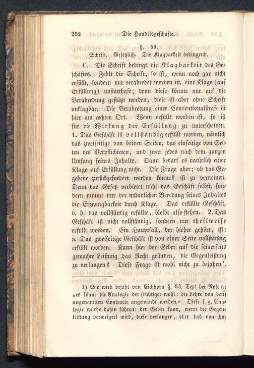 0. Die Schrift bedingt die Klagbarkeit des Ge-schäftes. Fehlt die Schrift, so ist, wenn noch gar nichterfüllt, sondern nur verabredet worden ist, eine Klage (ansErfüllung) unstatthaft; denn diese könnte nur auf dieVerabredung gestützt werden, diese ist aber ohne Schriftunklagbar. Die Verabredung einer Conventionalstrafe isthier am rechten Ort. Wenn erfüllt worden ist, so istfür die Wirkung der Erfüllung zu unterscheiden.1. Das Geschäft ist vollständig erfüllt worden, nämlichdas zweiseitige von beiden Seiten, das einseitige von Sei-ten des Verpflichteten, und zwar jedes nach dem ganzenUmfang seines Inhalts. Dann bedarf es natürlich einerKlage auf Erfüllung nicht. Die Frage aber: ob das Ge-gebene zurückgefordert werden könne? ist zu verneinen.Denn das Gesetz verbietet nicht das Geschäft selbst, son-dern nimmt nur der mündlichen Beredung seines Inhaltesdie Erzwingbarkeit durch Klage. Das erfüllte Geschäft,d. h. das vollständig erfüllte, bleibt also stehen. 2. DasGeschäft ist nicht vollständig, sondern nur theilweiseerfüllt worden. Ein Hauptfall, der hieher gehört, ist:u. Das zweiseitige Geschäft ist von einer Seite vollständigerfüllt worden. Kann hier der Geber auf die seinerseitsgemachte Leistung das Recht gründen, die Gegenleistungzu verlangen? Diese Frage ist wohl nicht zu bejahen',