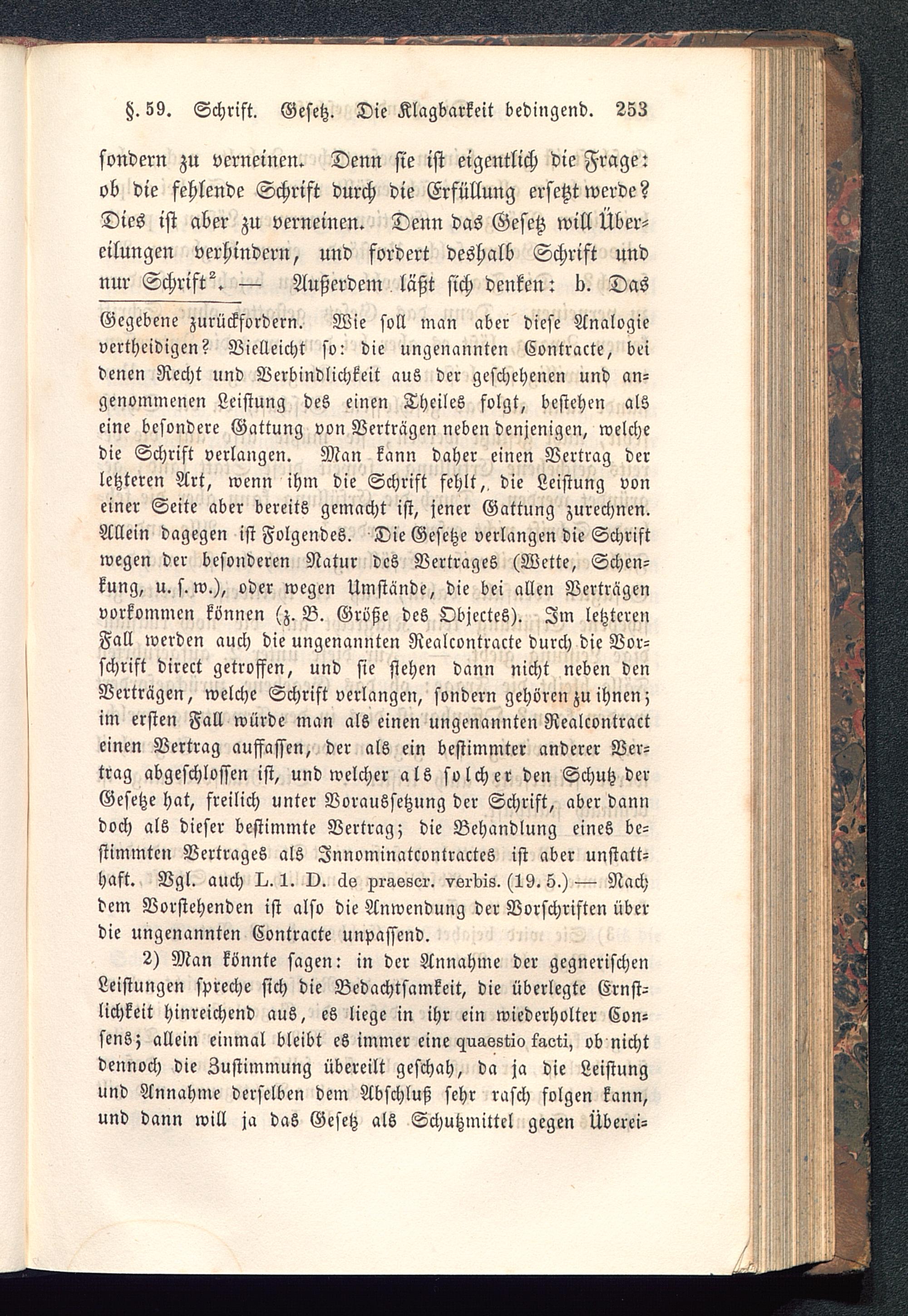 Gegebene zurückfordern. Wie soll man aber diese Analogievertheidigen? Vielleicht so: die ungenannten Contracte, beidenen Recht und Verbindlichkeit aus der geschehenen und an-genommenen Leistung des einen Theiles folgt, bestehen alseine besondere Gattung von Verträgen neben denjenigen, welchedie Schrift verlangen. Man kann daher einen Vertrag derletzteren Art, wenn ihm die Schrift fehlt,, die Leistung voneiner Seite aber bereits gemacht ist, jener Gattung zurechnen.Allein dagegen ist Folgendes. Die Gesetze verlangen die Schriftwegen der besonderen Natur des Vertrages (Wette, Schen-kung, u. s. w.), oder wegen Umstände, die bei allen Verträgenvorkommen können (z. B. Große des Objectes). Im letzterenFall werden auch die ungenannten Realcontracte durch die Vor-schrift direct getroffen, und sie stehen dann nicht neben denVerträgen, welche Schrift verlangen, sondern gehören zu ihnen;im ersten Fall würde man als einen ungenannten Realcontracteinen Vertrag auffassen, der als ein bestimmter anderer Ver-trag abgeschlossen ist, und welcher als solcher den Schutz derGesetze hat, freilich unter Voraussetzung der Schrift, aber danndoch als dieser bestimmte Vertrag; die Behandlung eines be-stimmten Vertrages als Jnnominatcontractcs ist aber unstatt-haft. Vgl. auch iU. 1. O. äs prassor. vordis. (19. 5.) — Nachdem Vorstehenden ist also die Anwendung der Vorschriften überdie ungenannten Contracte unpassend.