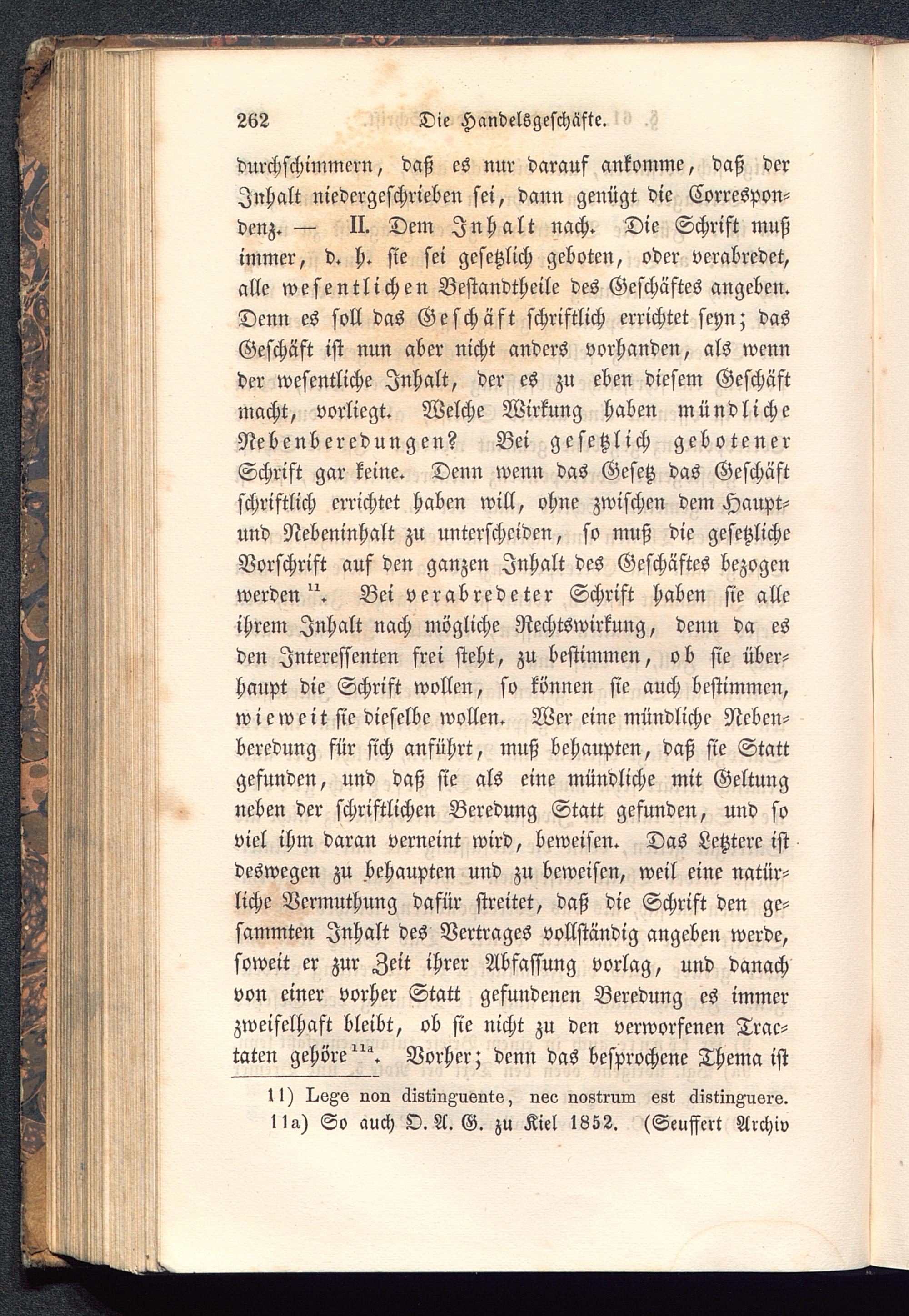 durchschimmern, daß es nur darauf ankomme, daß derInhalt niedergeschrieben sei, dann genügt die Correspon-denz. — II. Dem Inhalt nach. Die Schrift mußimmer, d. h. sie sei gesetzlich geboten, oder verabredet,alle wesentlichen Bestandtheile des Geschäftes angeben.Denn es soll das Geschäft schriftlich errichtet seyn; dasGeschäft ist nun aber nicht anders vorhanden, als wennder wesentliche Inhalt, der es zu eben diesem Geschäftmacht, vorliegt. Welche Wirkung haben mündlicheNebenberedungen? Bei gesetzlich gebotenerSchrift gar keine. Denn wenn das Gesetz das Geschäftschriftlich errichtet haben will, ohne zwischen dem Haupt-und Nebeninhalt zu unterscheiden, so muß die gesetzlicheVorschrift auf den ganzen Inhalt des Geschäftes bezogenwerden". Bei verabredeter Schrift haben sie alleihrem Inhalt nach mögliche Rechtswirkung, denn da esden Interessenten frei steht, zu bestimmen, ob sie über-haupt die Schrift wollen, so können sie auch bestimmen,wieweitsie dieselbe wollen. Wer eine mündliche Ncben-beredung für sich anführt, muß behaupten, daß sie Stattgefunden, und daß sie als eine mündliche mit Geltungneben der schriftlichen Beredung Statt gefunden, und soviel ihm daran verneint wird, beweisen. Das Letztere istdeswegen zu behaupten und zu beweisen, weil eine natür-liche Vermuthung dafür streitet, daß die Schrift den ge-sammten Inhalt des Vertrages vollständig angeben werde,soweit er zur Zeit ihrer Abfassung vorlag, und danachvon einer vorher Statt gefundenen Beredung es immerzweifelhaft bleibt, ob sie nicht zu den verworfenen Trak-taten gehöre"^. Vorher; denn das besprochene Thema ist