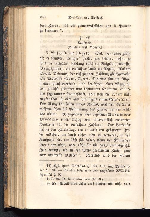 7. Aufgeld und Abgeld. Weil, wer später zahlt,als er schuldet, weniger^ zahlt, wer früher, mehr, sowird die verspätete Zahlung durch ein Aufgeld (Interesse,Verzugszinsen), die verfrühete durch ein Abgeld, (Rabatt,Decort, Disconto) der rechtzeitigen Zahlung gleichgemacht.Die Ausdrücke Rabatt, Decort, Disconto sind im Allge-meinen gleichbedeutend, und bezeichnen einen Abzug andem zunächst gedachten und bestimmten Kaufpreis, erfindeaus sogenannter Freundschaft, oder weil die Waare nichtempfangbar ist, oder aus sonst irgend einem Grunde Statt.Der Abzug hat selten etwas Reelles, weil der Verkäufermeistens schon bei Bestimmung des Preises auf ihn Rück-sicht nimmt. Vorzugsweise aber bezeichnet Rabatt oderDisconto einen Abzug vom unverzinslich creditirtenKaufpreis für die verfrühete Zahlung. Der Verkäuferrechnet den Zinsbetrag, den er durch den gestatteten Cre-dit entbehrt, um durch diesen nicht zu verlieren, in denKaufpreis ein, und läßt sich daher, wenn der KäuferdenCredit gar nicht, oder nicht für die ganze vorausgesetzteZeit benutzt, die in den Preis gerechneten Zinsen ganzoder theilweise abziehend Natürlich wird der Rabatt