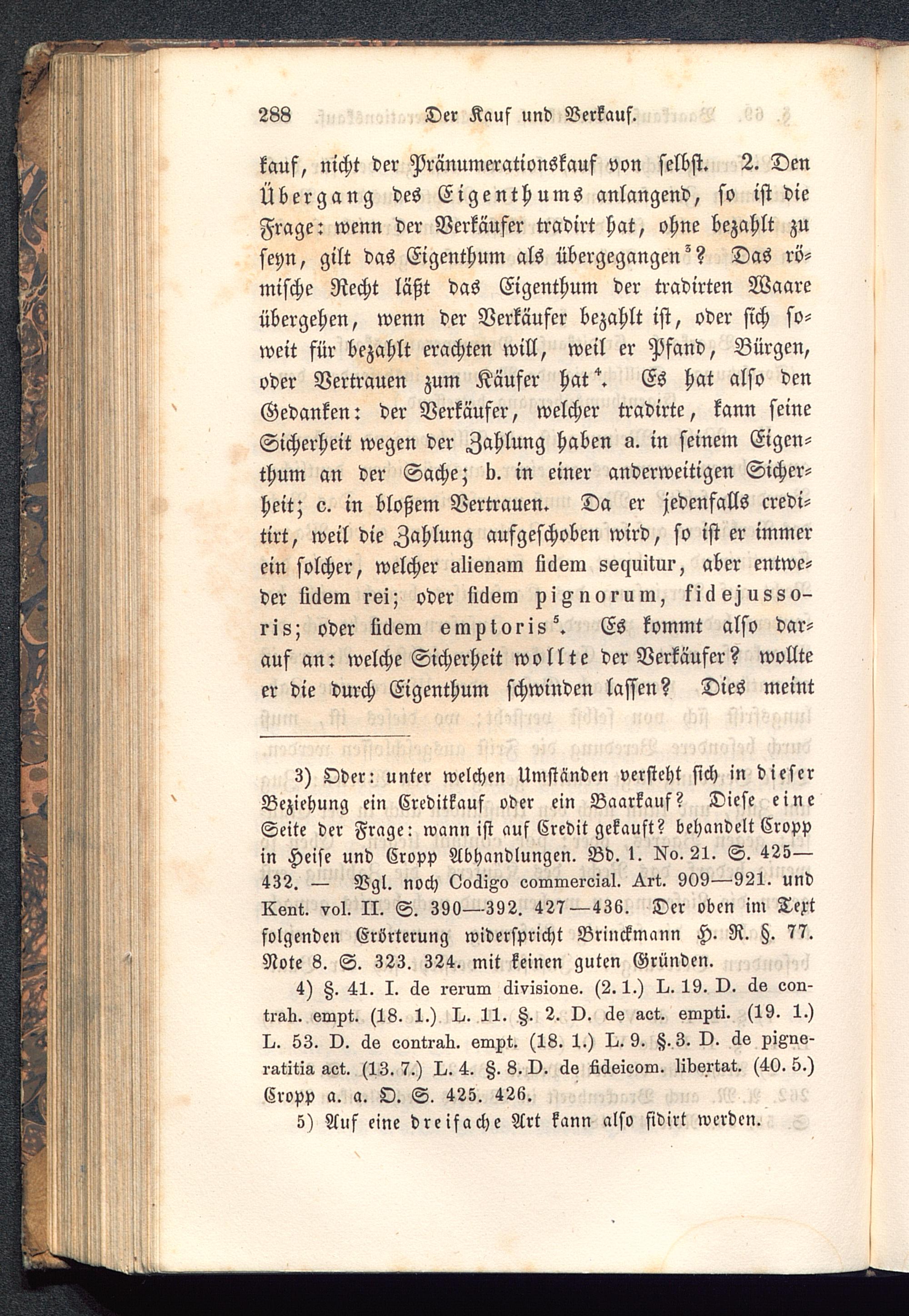 kauf, nicht der Pränumerationskauf von selbst. 2. DenÜbergang des Eigenthums anlangend, so ist dieFrage: wenn der Verkäufer tradirt hat, ohne bezahlt zuseyn, gilt das Eigenthum als übergegangen^? Das rö-mische Recht läßt das Eigenthum der tradirten Waareübergehen, wenn der Verkäufer bezahlt ist, oder sich so-weit für bezahlt erachten will, weil er Pfand, Bürgen,oder Vertrauen zum Käufer hat^. Es hat also denGedanken: der Verkäufer, welcher tradirte, kann seineSicherheit wegen der Zahlung haben u. in seinem Eigen-thum an der Sache; b. in einer anderweitigen Sicher-heit; o. in bloßem Vertrauen. Da er jedenfalls credi-tirt, weil die Zahlung aufgeschoben wird, so ist er immerein solcher, welcher uliennm kiciom sehuitur, aber entwe-der liäem roi; oder üäom piZmorum, kiclejusso-ris; oder üciem emptoris^. Es kommt also dar-auf an: welche Sicherheit wollte der Verkäufer? wollteer die durch Eigenthum schwinden lassen? Dies meint