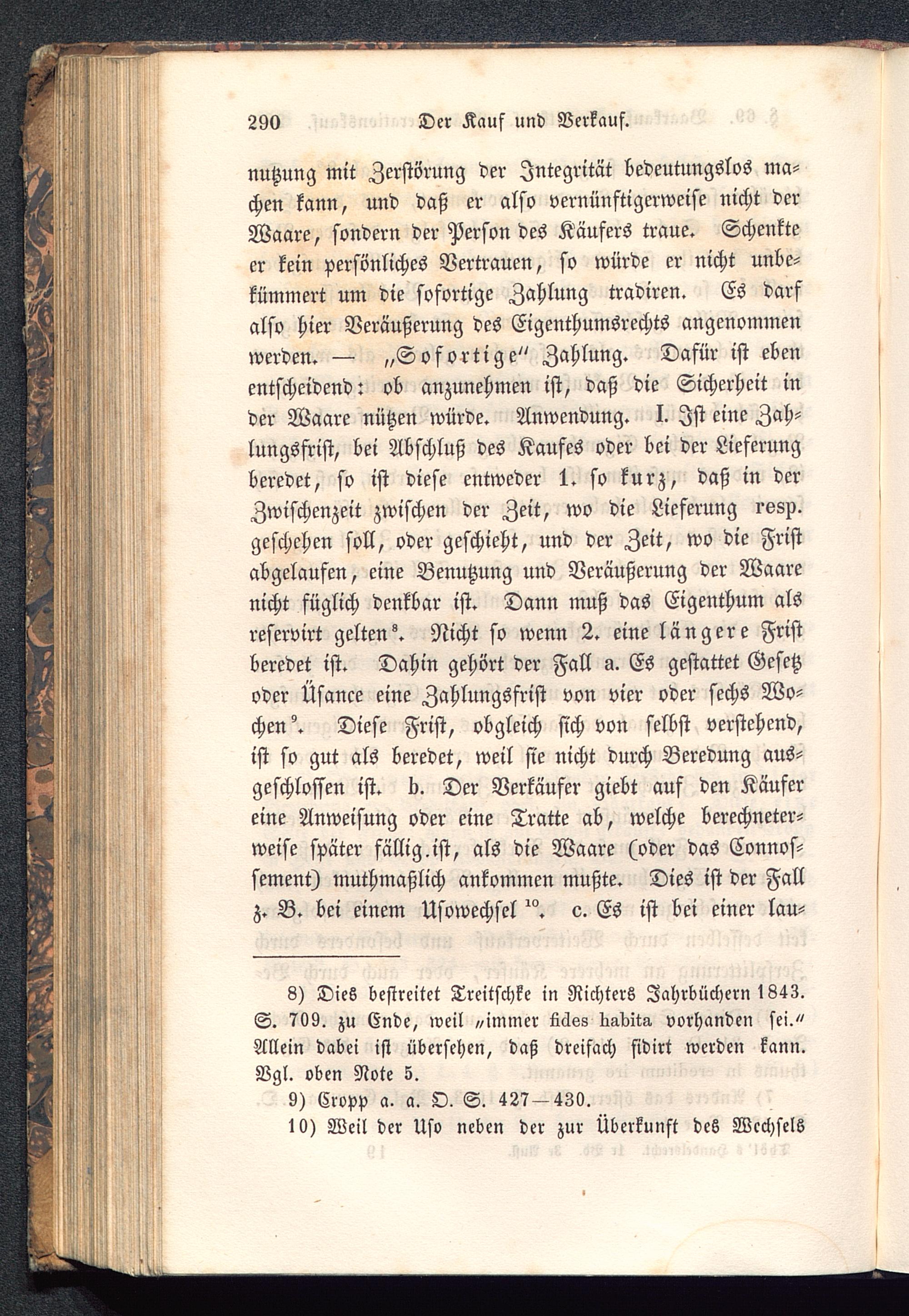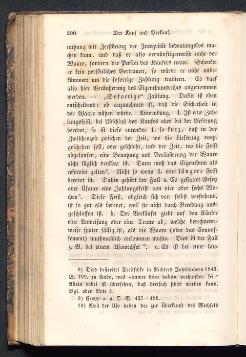 Nutzung mit Zerstörung der Integrität bedeutungslos ma-chen kann, und daß er also vernünftigerweise nicht derWaare, sondern der Person des Käufers traue. Schenkteer kein persönliches Vertrauen, so würde er nicht unbe-kümmert um die sofortige Zahlung tradiren. Es darfalso hier Veräußerung des Eigenthumsrechtö angenommenwerden. — „Sofortige" Zahlung. Dafür ist ebenentscheidend: ob anzunehmen ist, daß die Sicherheit inder Waare nützen würde. Anwendung. I. Ist eine Zah-lungsfrist, bei Abschluß des Kaufes oder bei der Lieferungberedet, so ist diese entweder 1. so kurz, daß in derZwischenzeit zwischen der Zeit, wo die Lieferung resp,geschehen soll, oder geschieht, und der Zeit, wo die Fristabgelaufen, eine Benutzung und Veräußerung der Waarenicht füglich denkbar ist. Dann muß das Eigenthum alsreservirt gelten'. Nicht so wenn 2. eine längere Fristberedet ist. Dahin gehört der Fall u. Es gestattet Gesetzoder Üsance eine Zahlungsfrist von vier oder sechs Wo-chen'. Diese Frist, obgleich sich von selbst verstehend,ist so gut als beredet, weil sie nicht durch Beredung aus-geschlossen ist. b. Der Verkäufer giebt auf den Käufereine Anweisung oder eine Tratte ab, welche berechneter-weise später fällig, ist, als die Waare (oder das Connos-sement) muthmaßlich ankommen mußte. Dies ist der Fallz. B. bei einem Usowechsele. Es ist bei einer lau-