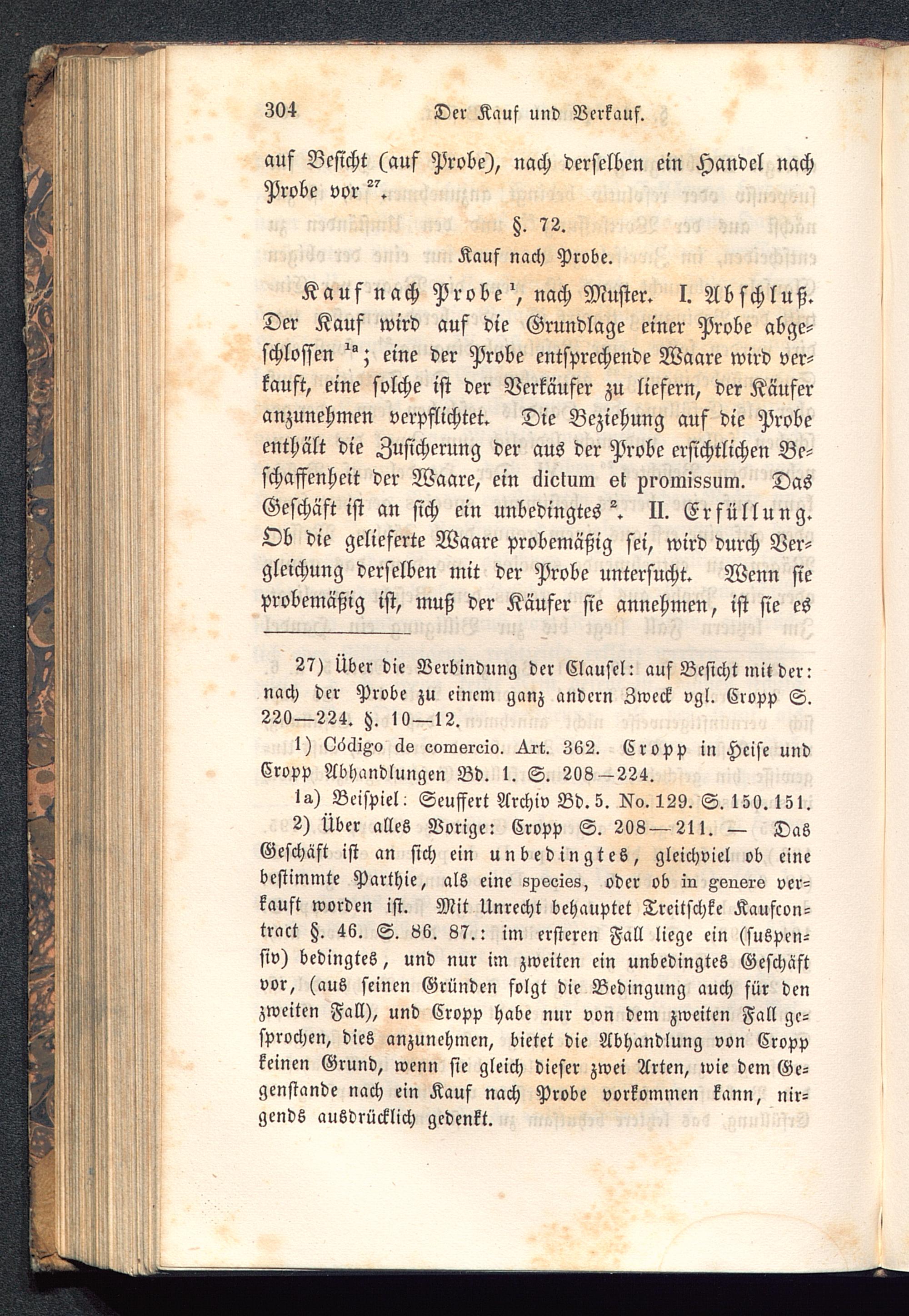 2) Über alles Vorige: Cropp S. 208 — 211. — DasGeschäft ist an sich ein unbedingtes, gleichviel ob einebestimmte Parthie, als eine sxeeiss, oder ob in Asnsrs ver-kauft worden ist. Mit Unrecht behauptet Trcitschke Kaufcon-tract §. 46. S. 86. 87.: im ersteren Fall liege ein (suspen-siv) bedingtes, und nur im zweiten ein unbedingtes Geschäftvor, (aus seinen Gründen folgt die Bedingung auch für denzweiten Fall), und Cropp habe nur von dem zweiten Fall ge-sprochen, dies anzunehmen, bietet die Abhandlung von Croppkeinen Grund, wenn sie gleich dieser zwei Arten, wie dem Ge-genstande nach ein Kauf nach Probe vorkommen kann, nir-gends ausdrücklich gedenkt.