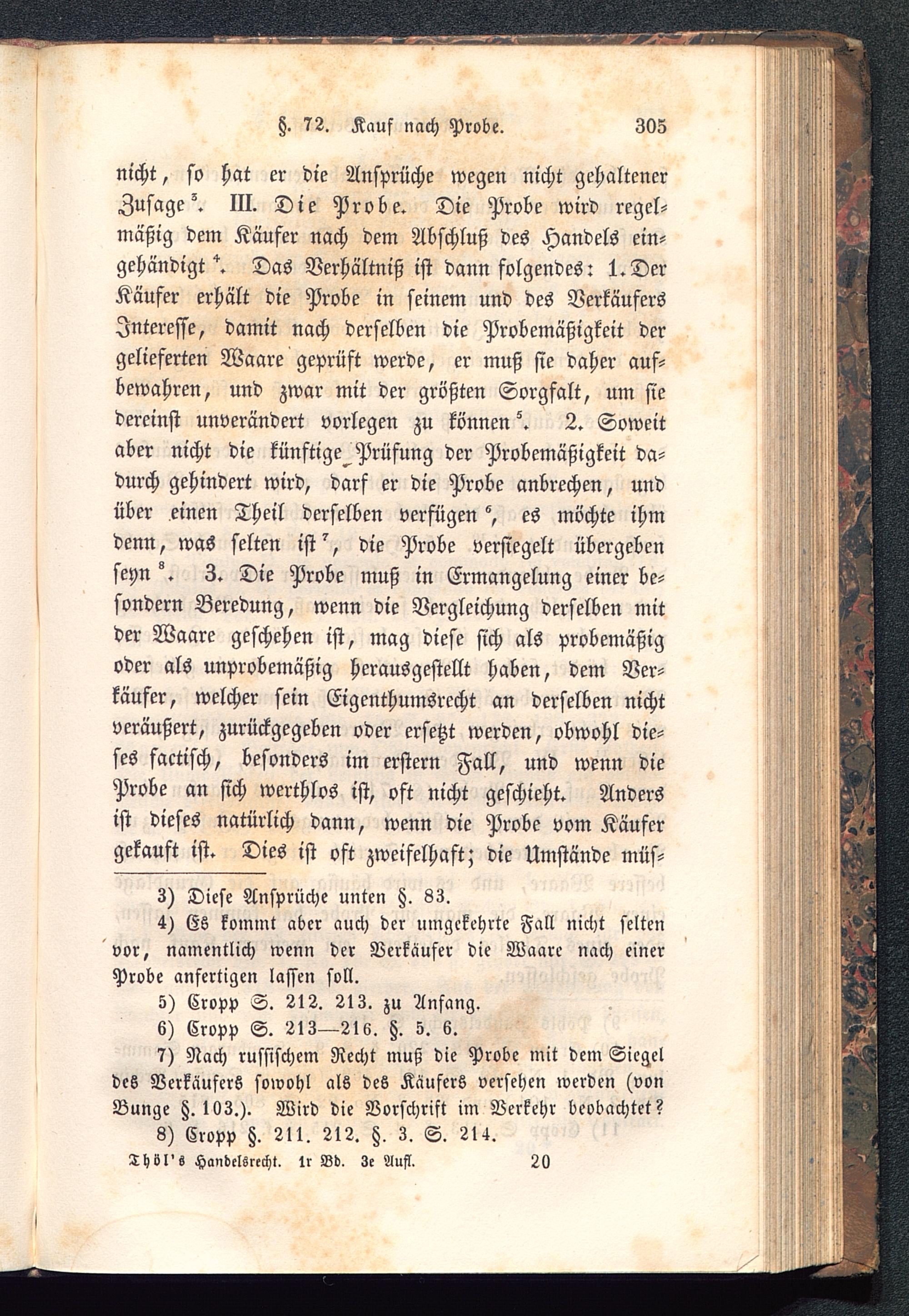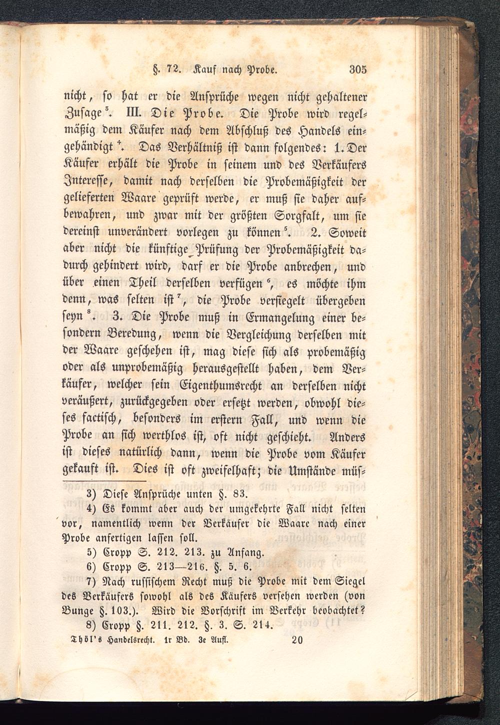 nicht, so hat er die Ansprüche wegen nicht gehaltenerZusaget III. Die Probe. Die Probe wird regel-mäßig dem Käufer nach dem Abschluß des Handels ein-gehändigt *. Das Verhältniß ist dann folgendes: I.DerKäufer erhält die Probe in seinem und des VerkäufersInteresse, damit nach derselben die Probemäßigkeit dergelieferten Waare geprüft werde, er muß sie daher auf-bewahren, und zwar mit der größten Sorgfalt, um siedereinst unverändert vorlegen zu könnend 2. Soweitaber nicht die künftige^ Prüfung der Probemäßigkeit da-durch gehindert wird, darf er die Probe anbrechen, undüber einen Theil derselben verfügen es möchte ihmdenn, was selten ist^, die Probe versiegelt übergebenseyn °. 3. Die Probe muß in Ermangelung einer be-sondern Beredung, wenn die Vergleichung derselben mitder Waare geschehen ist, mag diese sich als probemäßigoder als unprobemäßig herausgestellt haben, dem Ver-käufer, welcher sein Eigenthumsrccht an derselben nichtveräußert, zurückgegeben oder ersetzt werden, obwohl die-ses factisch, besonders im erster» Fall, und wenn dieProbe an sich werthlos ist, oft nicht geschieht. Andersist dieses natürlich dann, wenn die Probe vom Käufergekauft ist. Dies ist oft zweifelhaft; die Umstände müs-