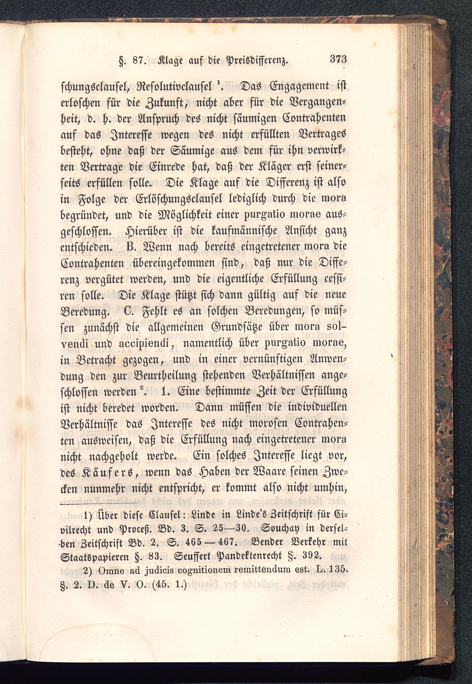 schungsclausel, Resolutivclausel Das Engagement isterloschen für die Zukunft, nicht aber für die Vergangen-heit, d. h. der Anspruch des nicht säumigen Contrahentenauf das Interesse wegen des nicht erfüllten Vertragesbesteht, ohne daß der Säumige aus dem für ihn verwirk-ten Vertrage die Einrede hat, daß der Kläger erst seiner-seits erfüllen solle. Die Klage auf die Differenz ist alsoin Folge der Erlöschungsclausel lediglich durch die morsbegründet, und die Möglichkeit einer pur^utio morue aus-geschlossen. Hierüber ist die kaufmännische Ansicht ganzentschieden, k. Wenn nach bereits eingetretener moru dieContrahenten übereingekommen sind, daß nur die Diffe-renz vergütet werden, und die eigentliche Erfüllung cessi-ren solle. Die Klage stützt sich dann gültig auf die neueBeredung. 0. Fehlt es an solchen Beredungen, so müs-sen zunächst die allgemeinen Grundsätze über moru sol-venäi und aeeipwncli, namentlich über pur^ulio moruo,in Betracht gezogen, und in einer vernünftigen Anwen-dung den zur Beurtheilung stehenden Verhältnissen ange-schlossen werden 1. Eine bestimmte Zeit der Erfüllungist nicht beredet worden. Dann müssen die individuellenVerhältnisse das Interesse des nicht morosen Contrahen-ten ausweisen, daß die Erfüllung nach eingetretener morgnicht nachgeholt werde. Ein solches Interesse liegt vor,des Käufers, wenn das Haben der Waare seinen Zwe-cken nunmehr nicht entspricht, er kommt also nicht umhin,