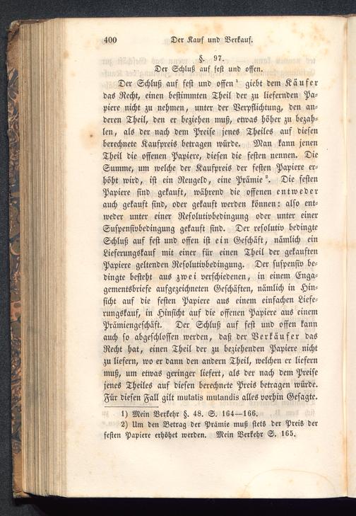 Der Schluß auf fest und offen ^ giebt dem Käuferdas Recht, einen bestimmten Theil der zu liefernden Pa-piere nicht zu nehmen, unter der Verpflichtung, den an-deren Theil, den er beziehen muß, etwas höher zu bezah-„ len, als der nach dem Preise jenes Theiles auf diesenberechnete Kaufpreis betragen würde. Man kann jenenTheil die offenen Papiere, diesen die festen nennen. DieSumme, um welche der Kaufpreis der festen Papiere er-höht wird, ist ein Reugeld, eine Prämie^. Die festenPapiere sind gekauft, während die offenen entwederauch gekauft sind, oder gekauft werden können: also ent-weder unter einer Resolutivbedingung oder unter einerSuspensivbedingung gekauft sind. Der resolutiv bedingteSchluß auf fest und offen ist ein Geschäft, nämlich einLieferungskauf mit einer für einen Theil der gekauftenPapiere geltenden Resolutivbedingung. Der suspensiv be-dingte besteht aus zwei verschiedenen, in einem Enga-gementsbriefe aufgezeichneten Geschäften, nämlich in Hin-sicht auf die festen Papiere aus einem einfachen Liefe-rungskauf, in Hinsicht auf die offenen Papiere aus einemPrämiengeschäft. Der Schluß auf fest und offen kannauch so abgeschlossen werden, daß der Verkäufer dasRecht hat, einen Theil der zu beziehenden Papiere nichtzu liefern, wo er dann den andern Theil, welchen er liefernmuß, um etwas geringer liefert, als der nach dem Preisejenes Theiles auf diesen berechnete Preis betragen würde.Für diesen Fall gilt mututis mutunciis alles vorhin Gesagte.