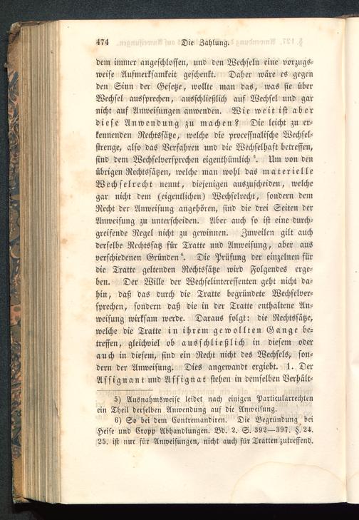 dem immer angeschlossen, und den Wechseln eine vorzugs-weise Aufmerksamkeit geschenkt. Daher wäre es gegenden Sinn der Gesetze, wollte man das, was sie überWechsel aussprechen, ausschließlich auf Wechsel und garnicht auf Anweisungen anwenden. Wie weit ist aberdiese Anwendung zu machen? Die leicht zu er-kennenden Rechtssätze, welche die processualische Wechsel-strenge, also das Verfahren und die Wechselhaft betreffen,sind dem Wechselversprechen eigenthümlich Um von denübrigen Rechtssätzen, welche man wohl das materielleWechselrecht nennt, diejenigen auszuscheiden, welchegar nicht dem (eigentlichen) Wechselrccht, sondern demRecht der Anweisung angehören, sind die drei Seiten derAnweisung zu unterscheiden. Aber auch so ist eine durch-greifende Regel nicht zu gewinnen. Zuweilen gilt auchderselbe Nechtssatz für Tratte und Anweisung, aber ausverschiedenen Gründen') Die Prüfung der einzelnen fürdie Tratte geltenden Rechtssätze wird Folgendes erge-ben. Der Wille der Wechselinteressenten geht nicht da-hin, daß das durch die Tratte begründete Wechselver-sprechen, sondern daß die in der Tratte enthaltene An-weisung wirksam werde. Daraus folgt: die Rechtssätze,welche die Tratte in ihrem gewollten Gange be-treffen, gleichviel ob ausschließlich in diesem oderauch in diesem, sind ein Recht nicht des Wechsels, son-dern der Anweisung. Dies angewandt ergiebt. 1. DerAssignant und Assignat stehen in demselben Verhält-