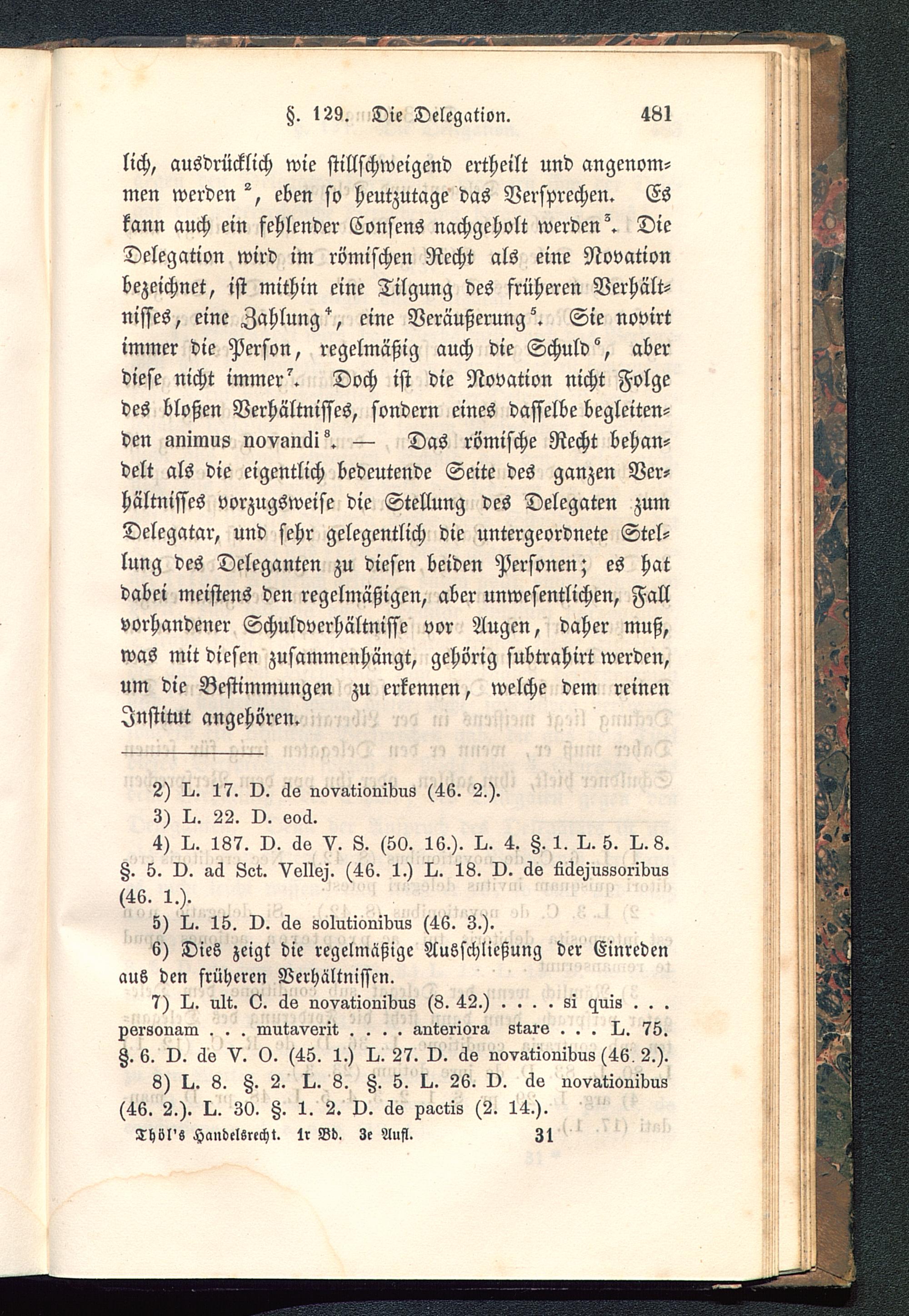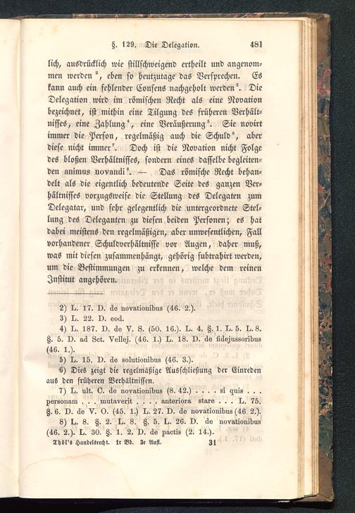 lich, ausdrücklich wie stillschweigend ertheilt und angenom-men werden^, eben so heutzutage das Versprechen. Eskann auch ein fehlender Consens nachgeholt werdend DieDelegation wird im römischen Recht als eine Novationbezeichnet, ist mithin eine Tilgung des früheren Verhält-nisses, eine Zahlung*, eine Veräußerung Sie novirtimmer die Person, regelmäßig auch die Schuld aberdiese nicht immer''. Doch ist die Novation nicht Folgedes bloßen Verhältnisses, sondern eines dasselbe begleiten-den kmimus n0Vimäi°. — Das römische Recht behan-delt als die eigentlich bedeutende Seite des ganzen Ver-hältnisses vorzugsweise die Stellung des Delegaten zumDelegatar, und sehr gelegentlich die untergeordnete Stel-lung des Deleganten zu diesen beiden Personen; es hatdabei meistens den regelmäßigen, aber unwesentlichen, Fallvorhandener Schuldverhältnisse vor Augen, daher muß,was mit diesen zusammenhängt, gehörig subtrahirt werden,um die Bestimmungen zu erkennen, welche dem reinenInstitut angehören.