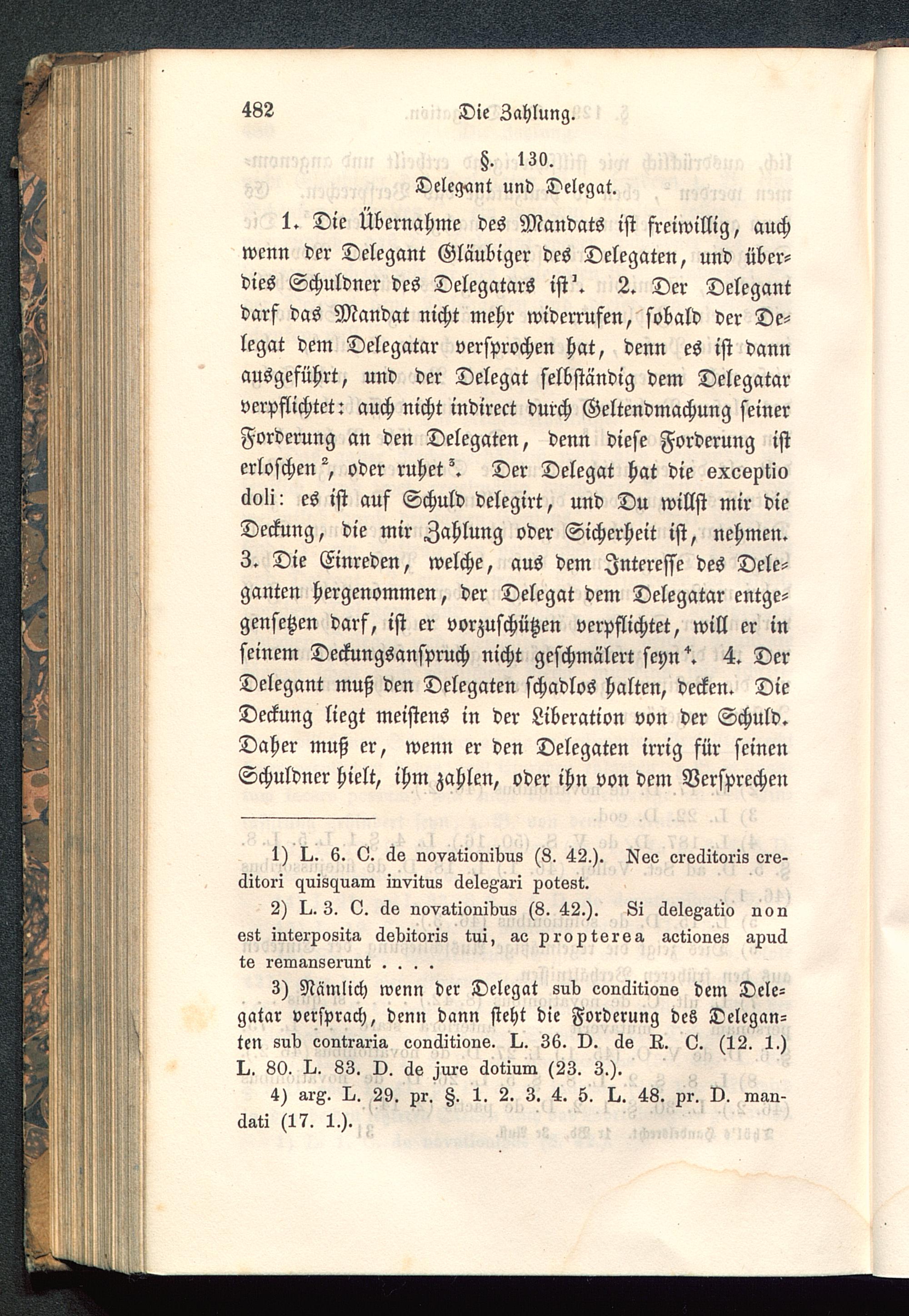 1. Die Übernahme des Mandats ist freiwillig, auchwenn der Delegant Gläubiger des Delegaten, und über-dies Schuldner des Delegatars ist'. 2. Der Delegantdarf das Mandat nicht mehr widerrufen, sobald der De-legat dem Delegatar versprochen hat, denn es ist dannausgeführt, und der Delegat selbständig dem Delegatarverpflichtet: auch nicht indirect durch Geltendmachung seinerForderung an den Delegaten, denn diese Forderung isterloschen ^ oder ruhet Der Delegat hat die exeoptic»äoli: es ist auf Schuld delegirt, und Du willst mir dieDeckung, die mir Zahlung oder Sicherheit ist, nehmen.3. Die Einreden, welche, aus dem Interesse des Dele-ganten hergenommen, der Delegat dem Delegatar entge-gensetzen darf, ist er vorzuschützen verpflichtet, will er inseinem Deckungsanspruch nicht geschmälert seyn''. 4. DerDelegant muß den Delegaten schadlos halten, decken. DieDeckung liegt meistens in der Liberation von der Schuld.Daher muß er, wenn er den Delegaten irrig für seinenSchuldner hielt, ihm zahlen, oder ihn von den: Versprechen