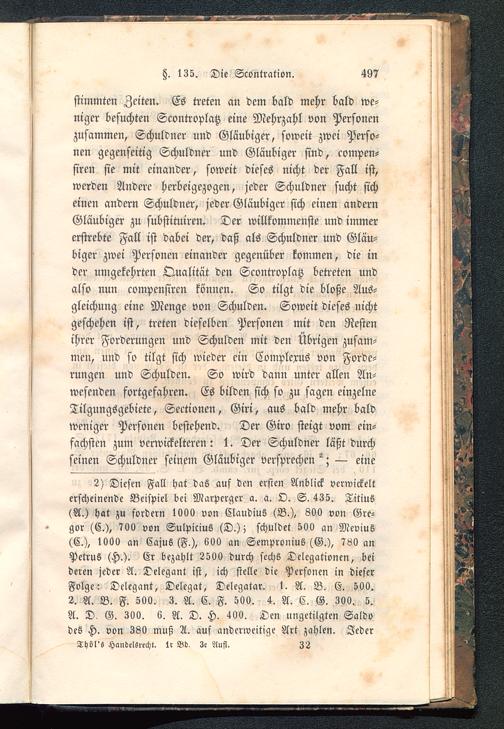 2) Diesen Fall hat das auf den ersten Anblick verwickelterscheinende Beispiel bei Marpcrger a. a. O. S. 435. TitinS(A.) hat zu fordern 1900 von Claudius (B.), 800 von Gre-gor (C.), 700 von Sulpicius (D.); schuldet 500 an Mevius(C.), 1000 an Cajus (F.), 600 an Sempronius (G.), 760 anPetrus (H.). Er bezahlt 2500 durch sechs Delegationen, beideren jeder A. Delegant ist, ich stelle die Personen in dieserFolge: Delegant, Delcgat, Delegatar. 1. A. B. E. 500.2. A. B. F. 500. 3. A. C. F. 50g. 4. A. C. G. 300. 5.A. D. G. 300. 6. A. D. H, 400. Den ungetilgten Saldodes H. von 380 muß A. auf anderweitige Art zahlen. ZederThöl's Handelsrecht, tr Bd. 3e Aufl. 32