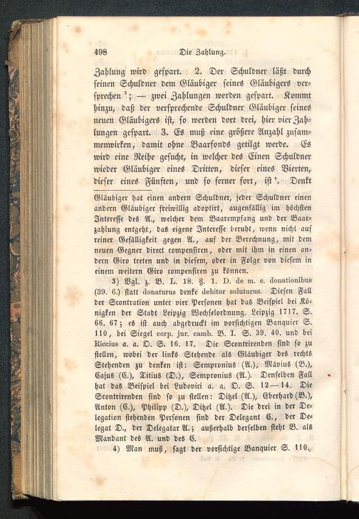3) Vgl. z. B. I,. 18. H. 1. v. äs m. v. äonationidusf39. 6.) statt äonaturus denke äslzitor soluturus. Diesen Fallder Scontration unter vier Personen hat das Beispiel bei Kö-nigkcn der Stadt Leipzig Wechselordnung. Leipzig 1717. S.66. 67 ; es ist auch abgedruckt im vorsichtigen Banquier S.116, bei Siegel aorp. ^ur. eamd. B. I. S. 39. 46. und beiKleoius a. a. O. S. 16. 17. Die Scontrirenden sind so zustellen, wobei der links Stehende als Gläubiger des rechtsStehenden zu denken ist: Sempronius (A.), Mävius (B.),Cajus (C.), Titius (D.), Sempronius (A.). Denselben Fallhat das Beispiel bei Ludovici a. a. O. S. 12—14. DieScontrirenden sind so zu stellen: Ditzel (A.), Eberhard (B.),Anton (C.), Philipp (D.), Ditzel (A.)> Die drei in der De-legation stehenden Personen sind der Delegant C., der De-legat D., der Delegatar A.; außerhalb derselben steht B. alsMandant des A. und des C.
